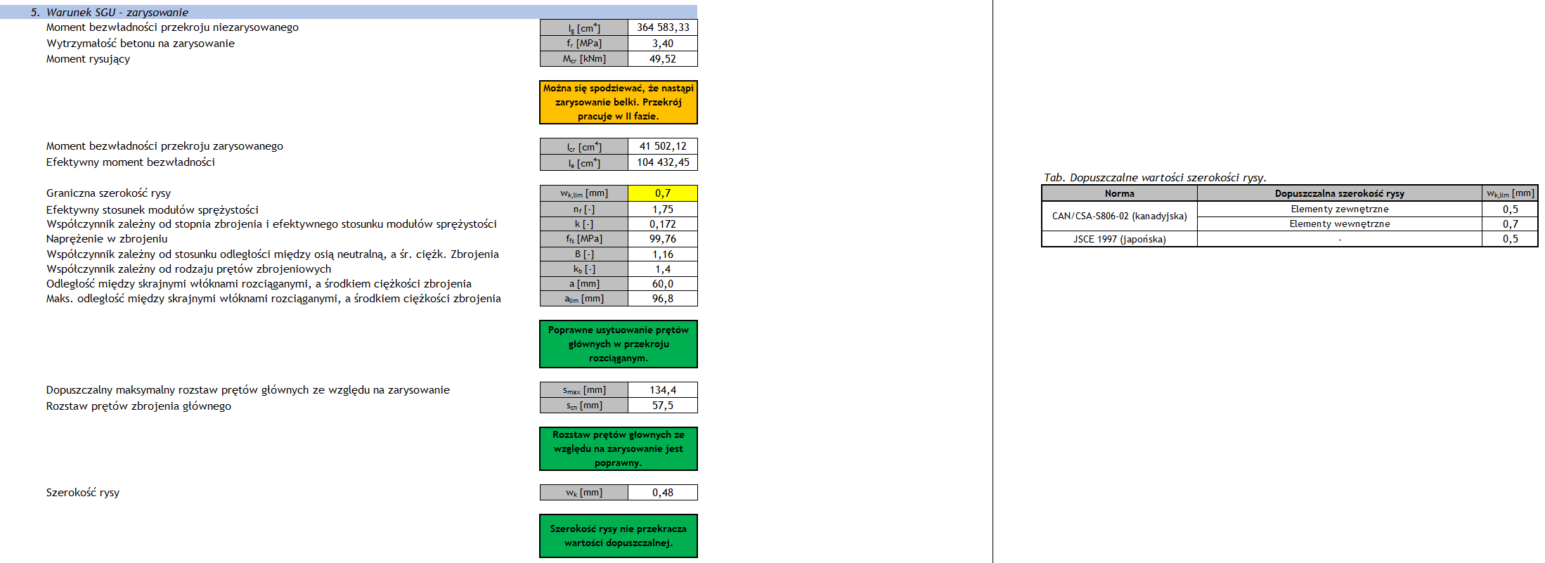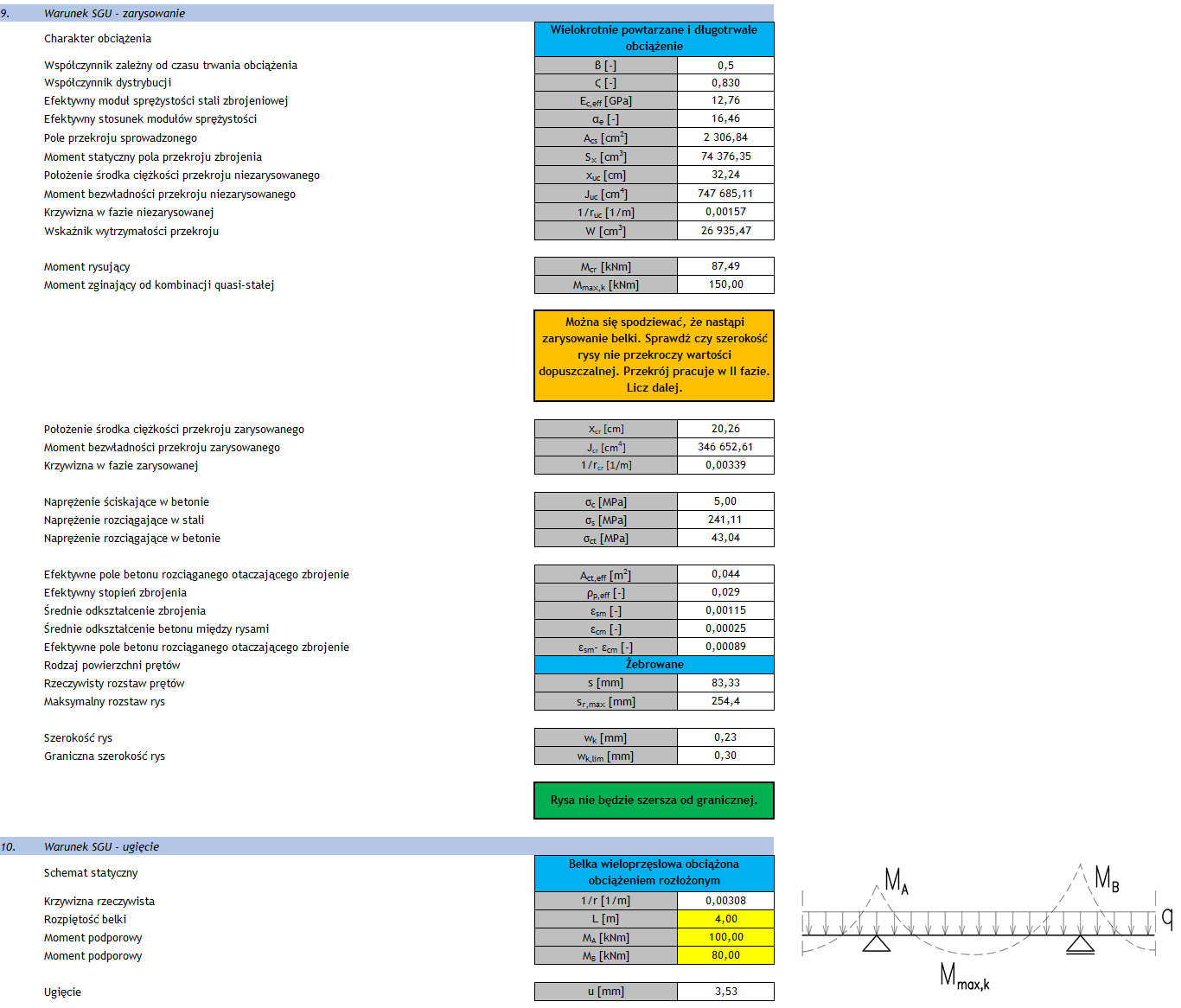 Program inżynierski przeznaczony do sprawdzenia stanu granicznego użytkowalności – przemieszczeń pionowych. Zawiera w sobie 10 osobnych kalkulatorów do obliczania ugięć w zależności od danego schematu statycznego. Oprócz przemieszczeń pionowych, program podaje reakcje oraz maksymalne momenty zginające. Program działa w środowisku Microsoft Excel. |
