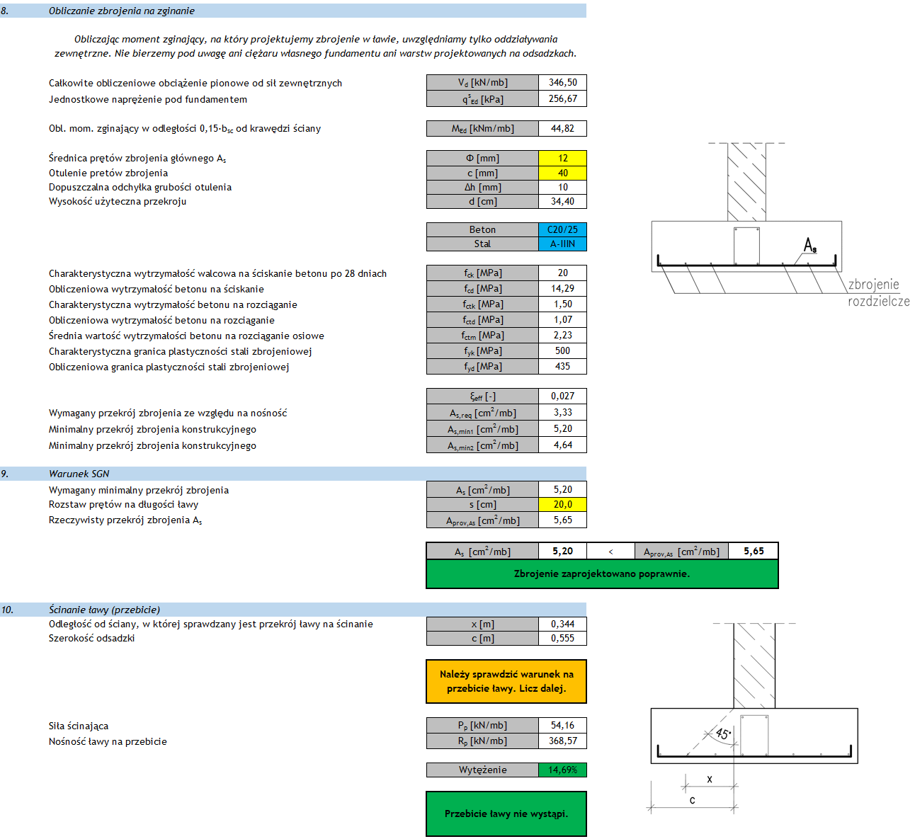 Program pozwala na pełne zwymiarowanie ławy fundamentowej wewnętrznej i zewnętrznej (z momentem zginającym) – dobór geometrii łąwy ze względu na nośność podłoża, określenie zbrojenia z uwzględnieniem ścinania według norm PN-EN 1992 i PN-EN 1997 (Eurokod 2 i 7). Program działa w środowisku Microsoft Excel. |