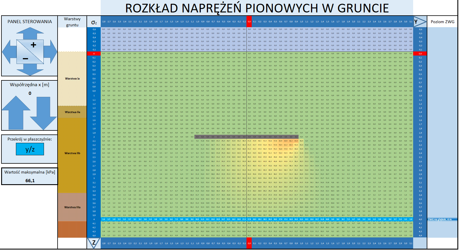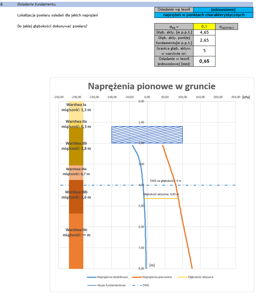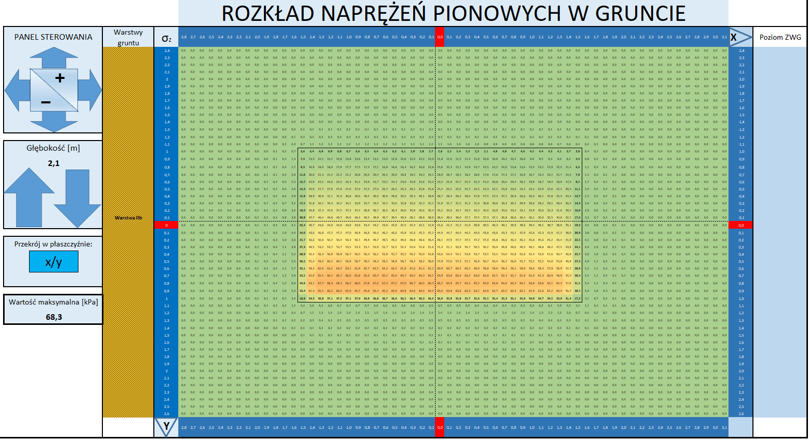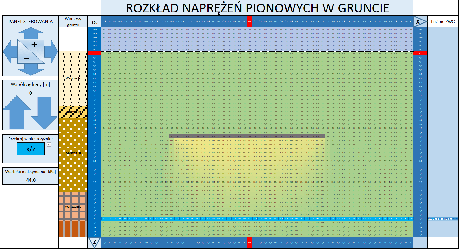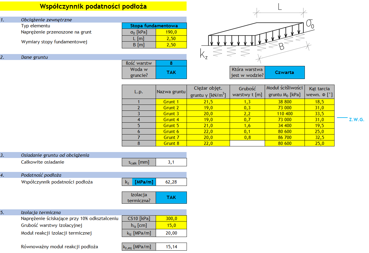 Program przeznaczony do obliczania współczynnika podatności w podłożu uwarstwionym i całkowitych osiadań od przyłożonego naprężenia. Arkusz pozwala na zadanie oddziaływania na grunt bez ograniczenia geometrii (płyta fundamentowa) oraz z jej ograniczeniem (stopa fundamentowa). Program działa w środowisku Microsoft Excel. |