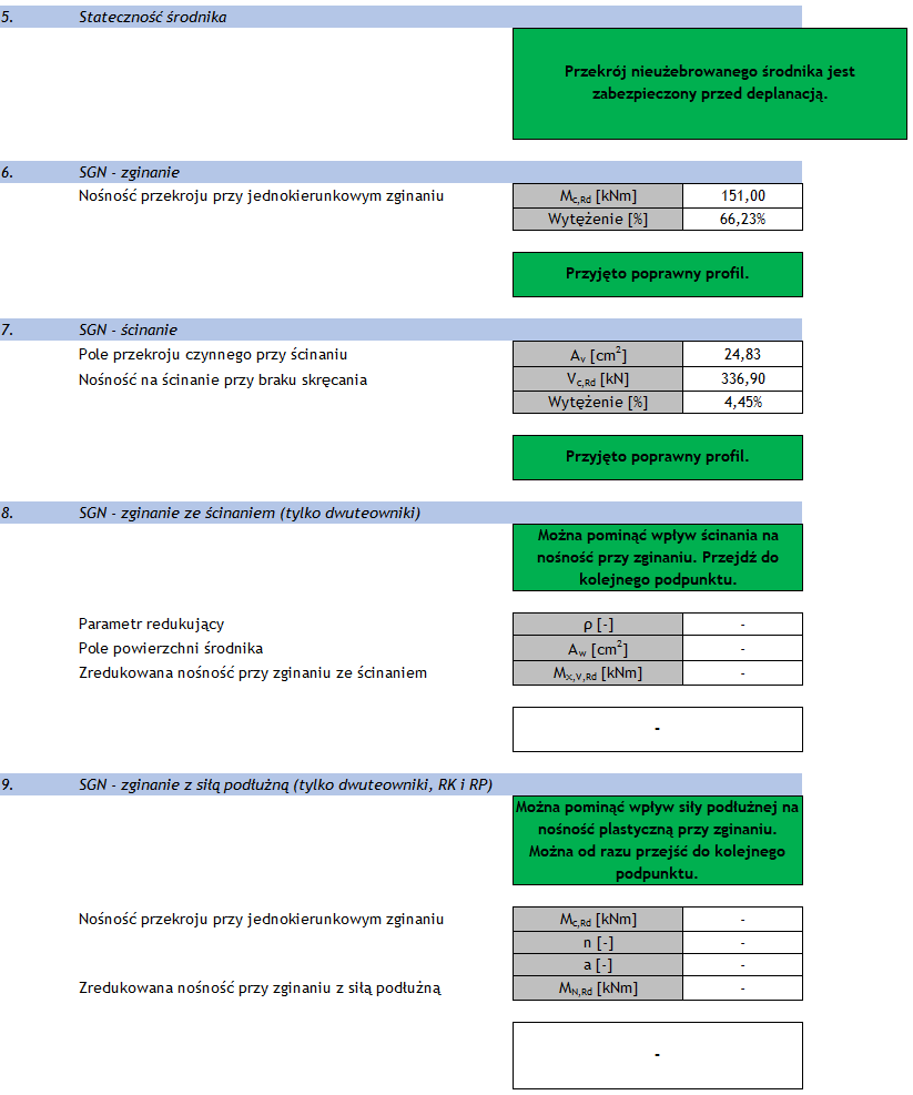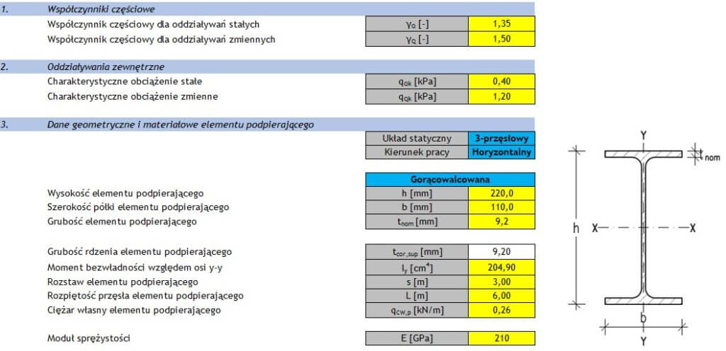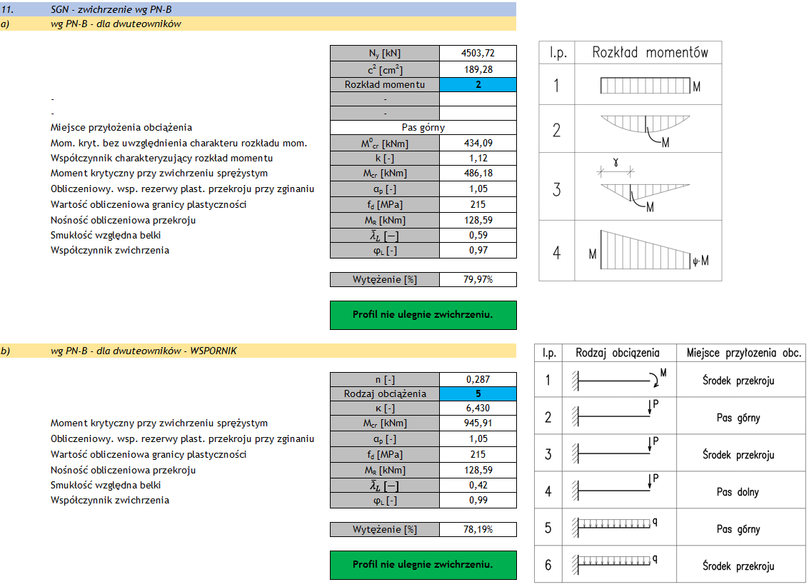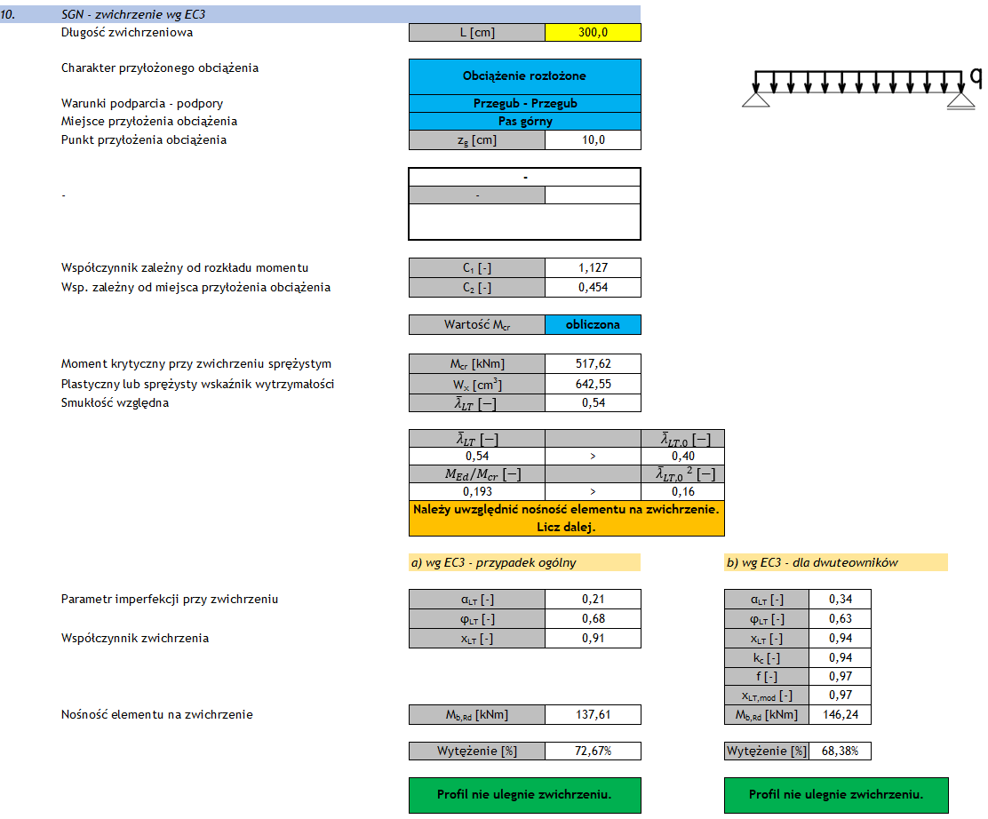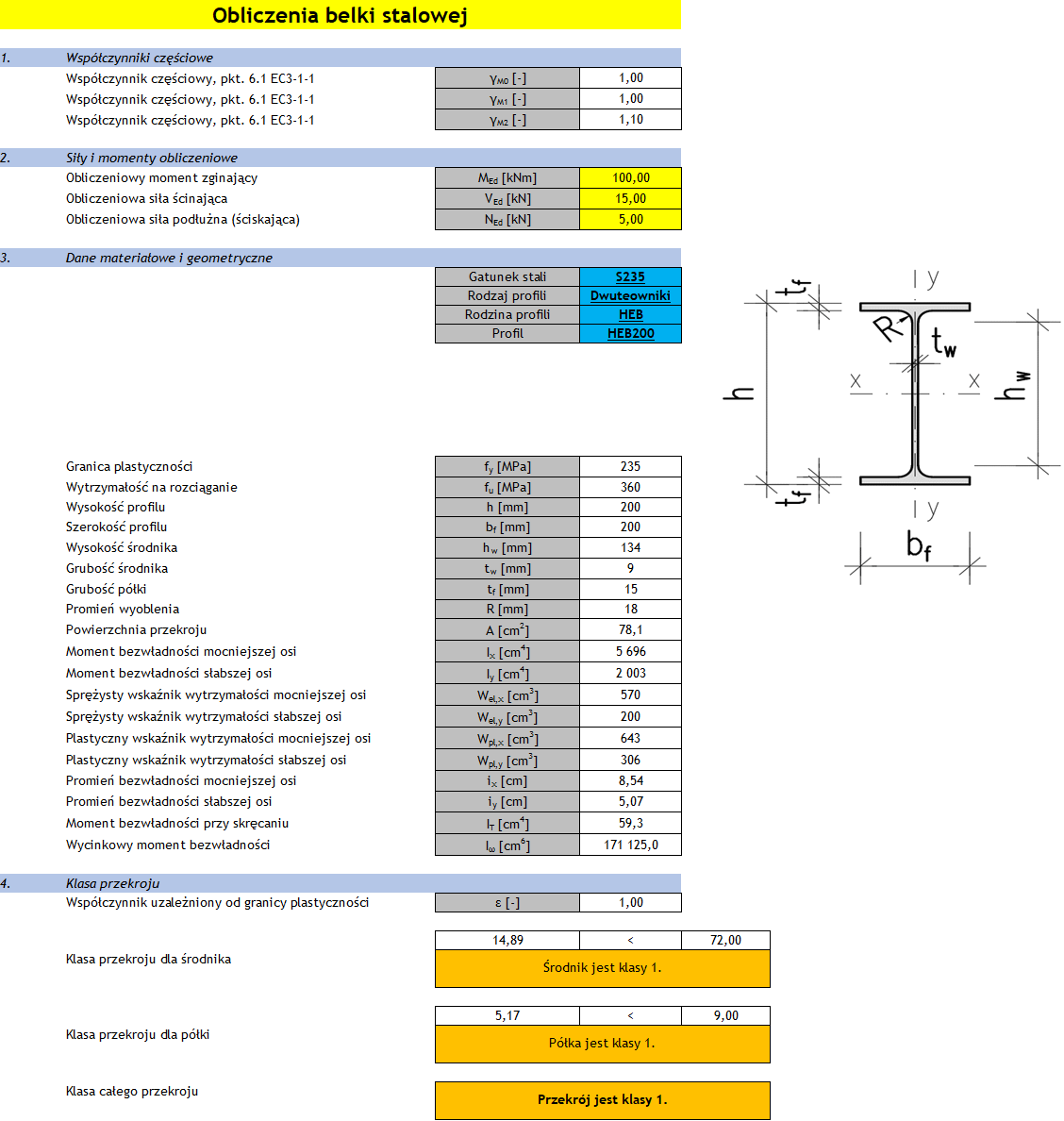 | belka stalowa kalkulatoryinzynierskie.pl | Program pozwala na pełne zwymiarowanie belki stalowej o przekroju dwuteowym (HEB, HEA, IPE, IPN), ceowym (UPE, UPN), teowym (½HEB, ½HEA, ½IPE) oraz zamkniętym (rura kwadratowa/prostokątna i okrągła) według normy europejskiej PN-EN 1993 (EC3) i krajowej PN-B. Program działa w środowisku Microsoft Excel. |