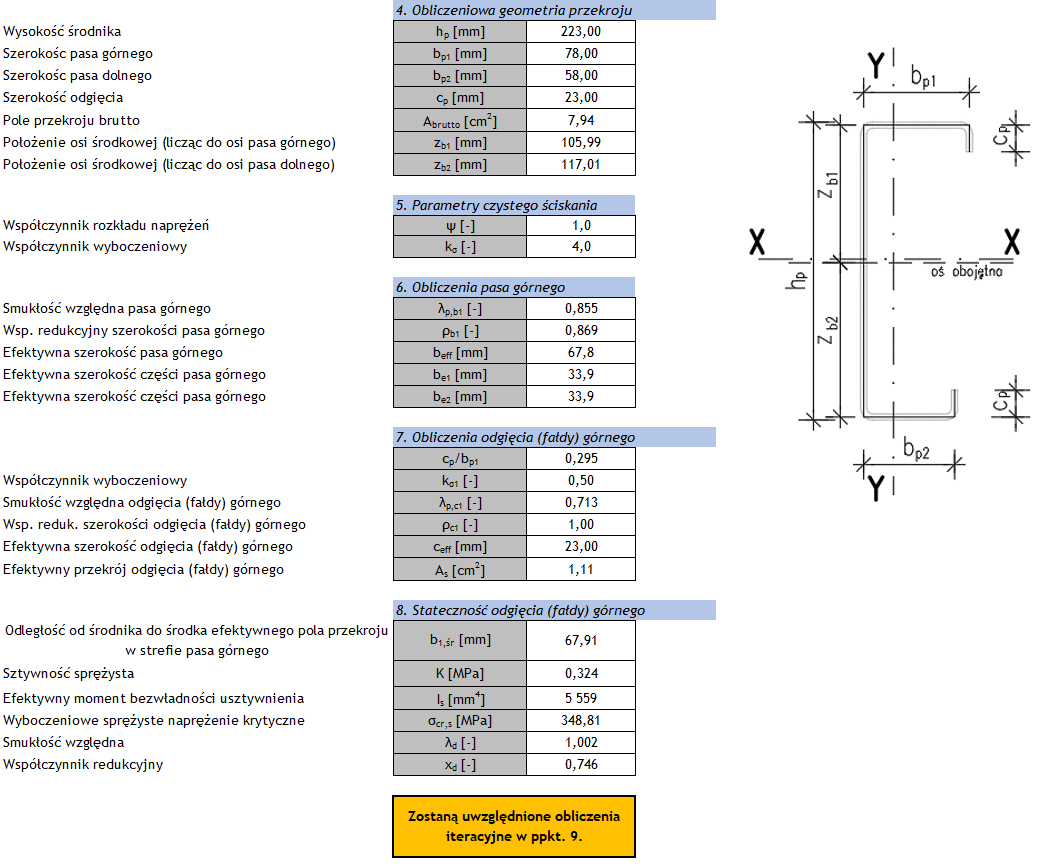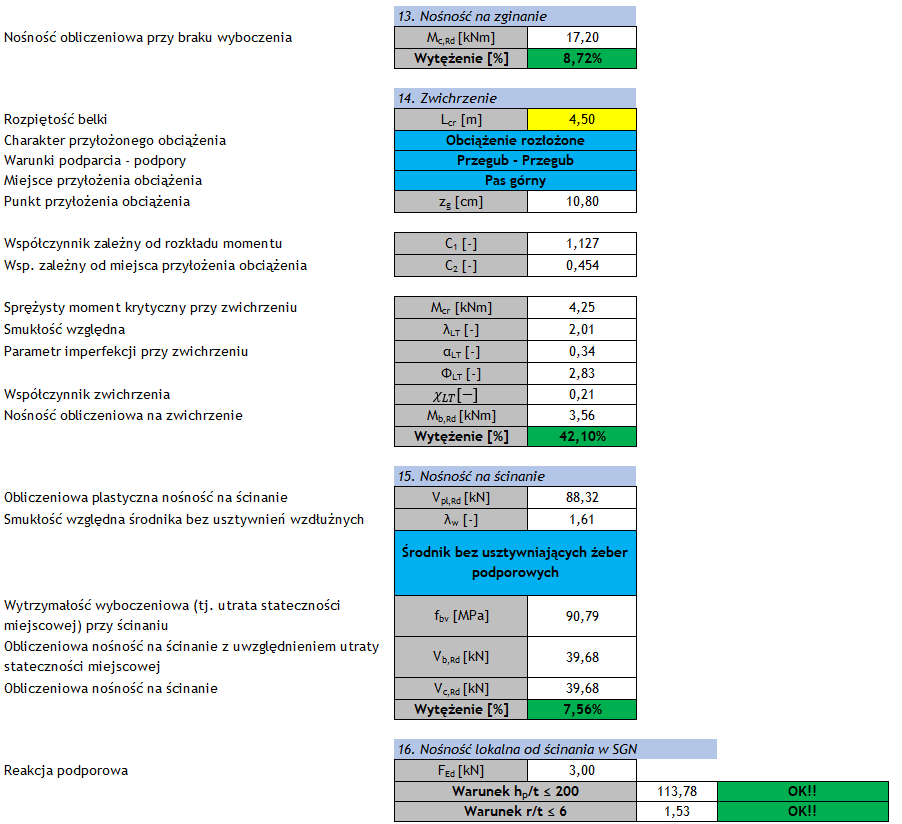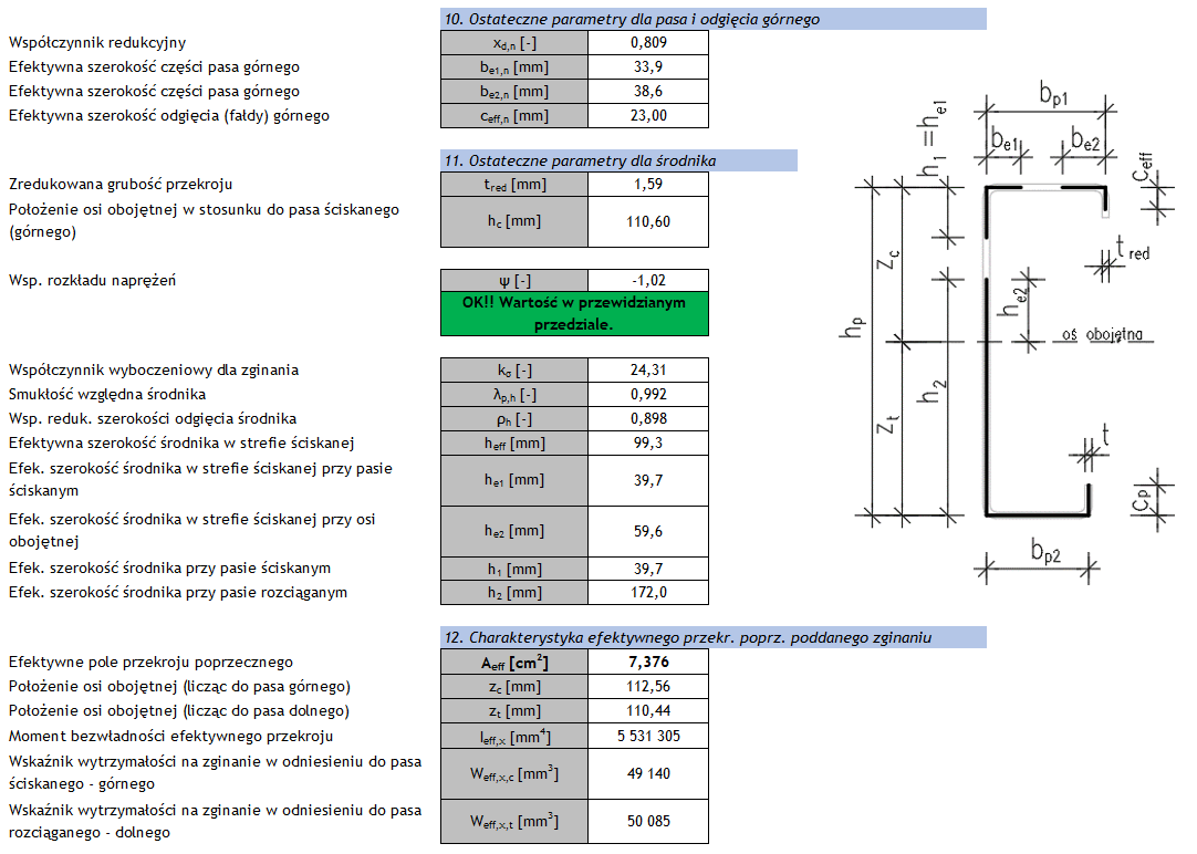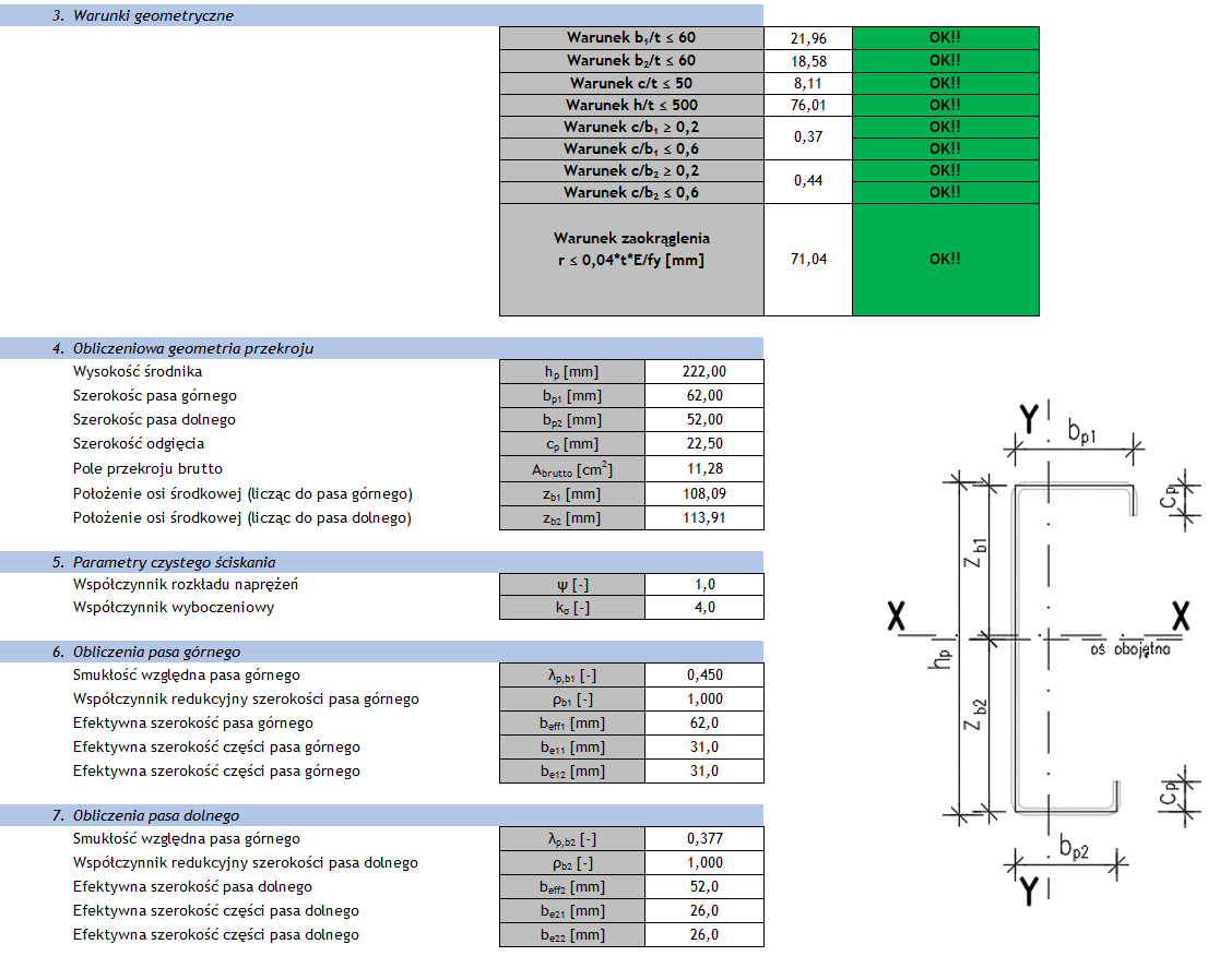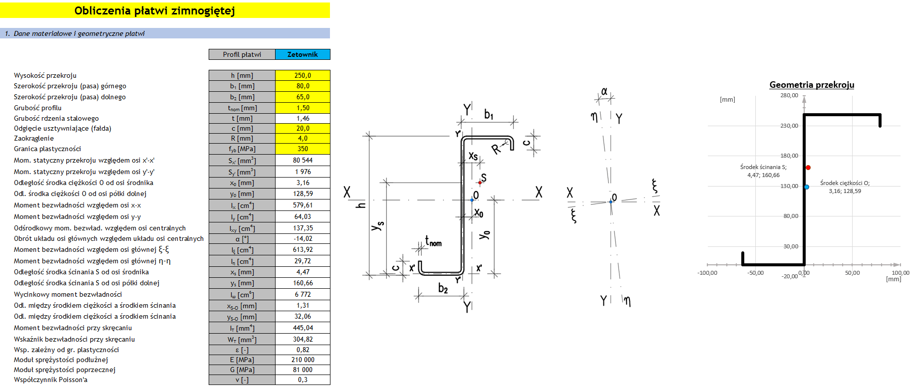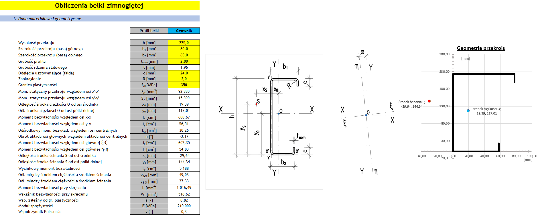 | belka zimnogięta kalkulatoryinzynierskie.pl | Program pozwala na pełne zwymiarowanie belki stalowej cienkościennej o przekroju ceownika półzamkniętego (z odgięciami) oraz zetownika wg norm PN-EN 1993-1-1 i 1-3 (Eurokod 3). Program działa w środowisku Microsoft Excel. |