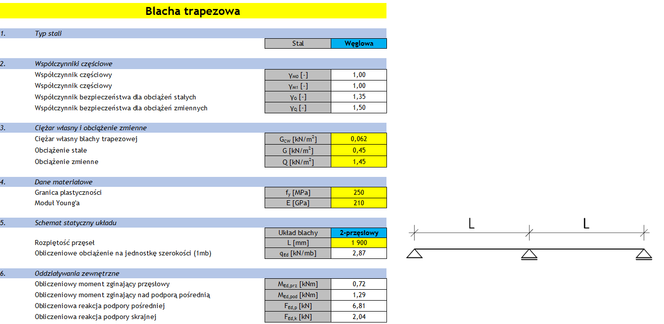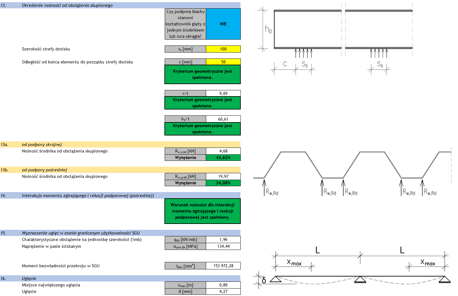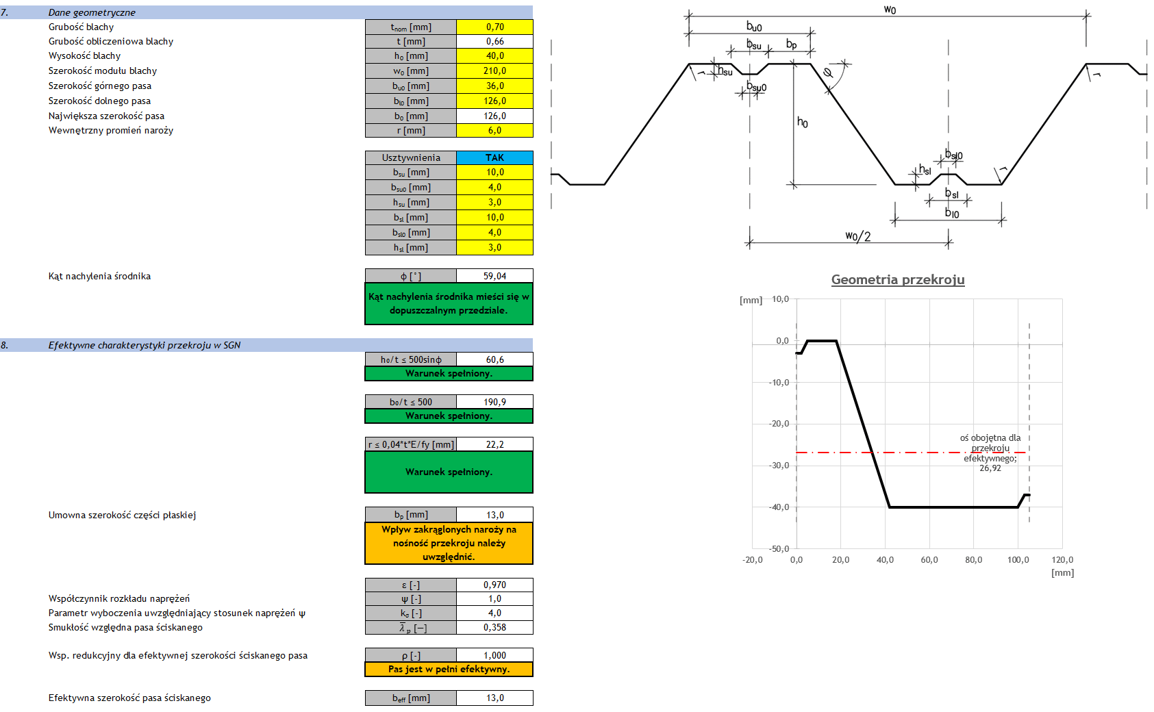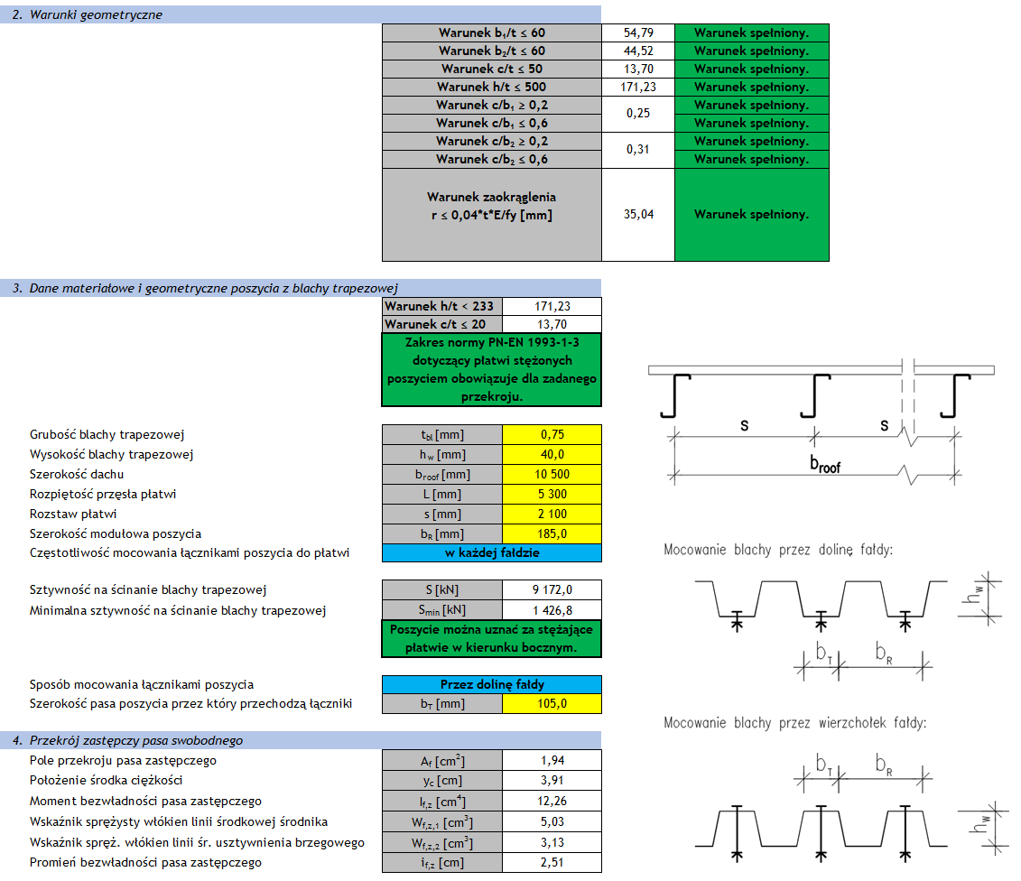 | blacha trapezowa kalkulatoryinzynierskie.pl | Program pozwala na pełne zwymiarowanie blachy trapezowej (fałdowej) o dowolnej geometrii z opcją pojedynczych usztywnień zlokalizowanych w pasach wg normy PN-EN 1993-1-1 i 1-3 (Eurokod 3). Użytkownik ma możliwość zadania układu do 3 przęseł. Program działa w środowisku Microsoft Excel. |