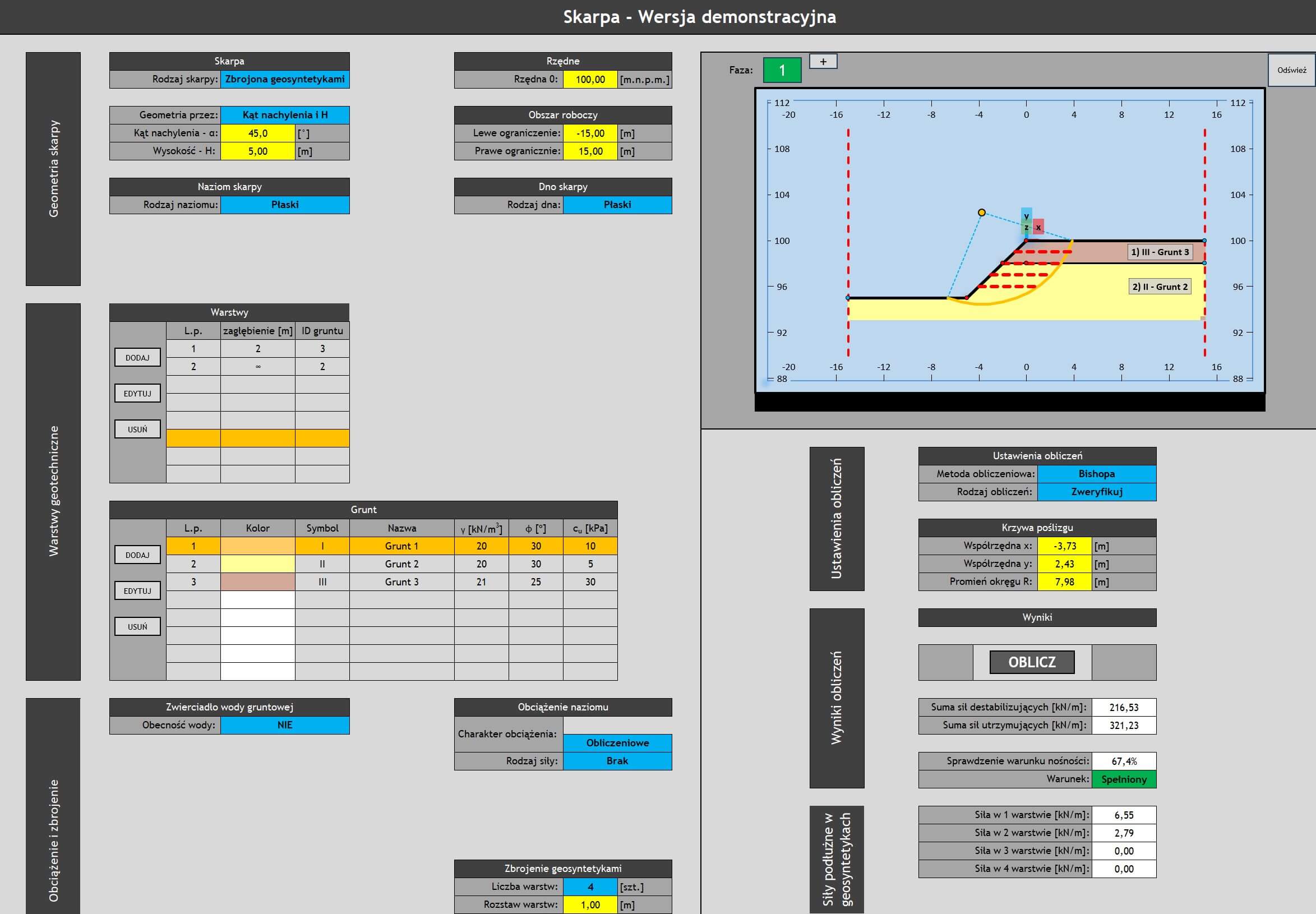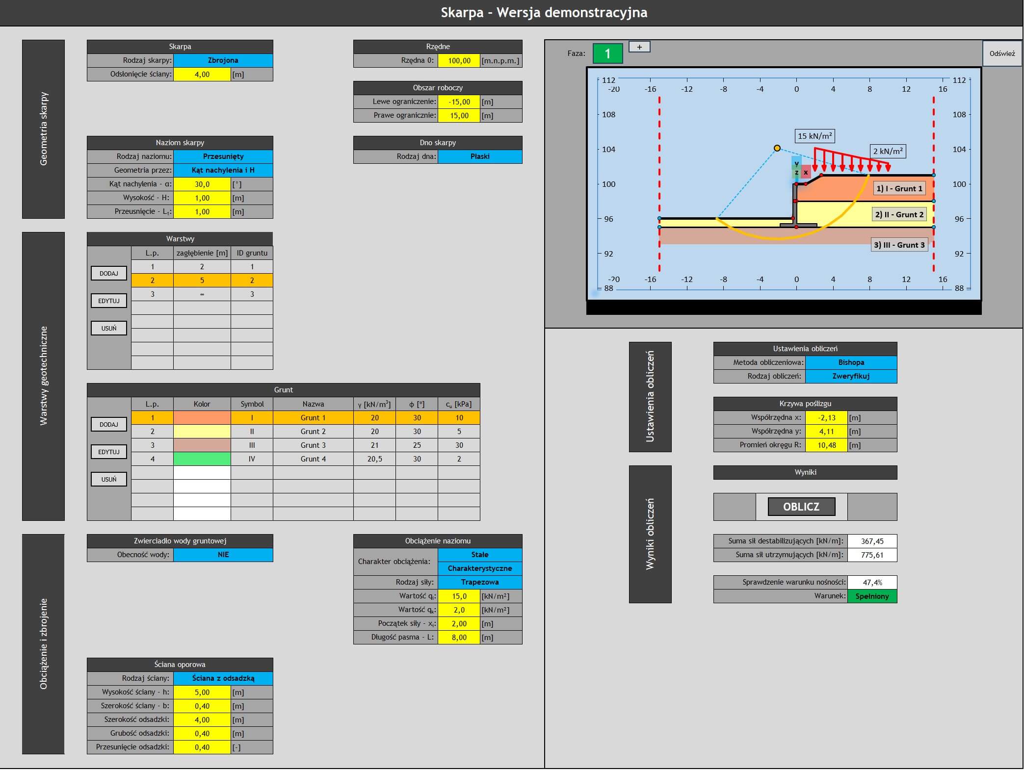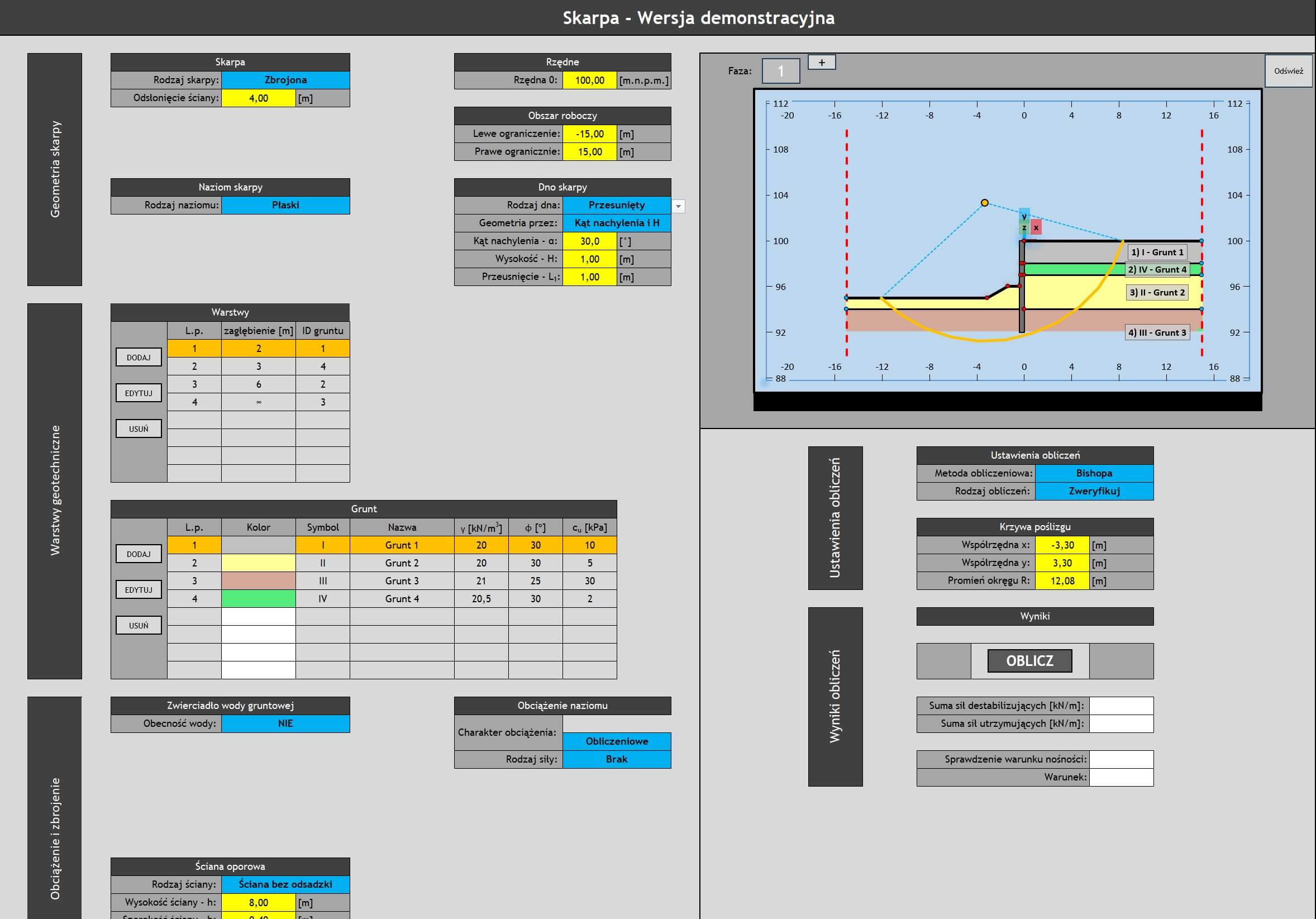 Program służy do przeprowadzania analizy stateczności skarpy w zależności od jej geometrii, obciążenia naziomu i warunków gruntowo-wodnych według normy PN-EN 1997 (Eurokod 7). Model obliczeniowy wprowadzany jest w sposób parametryczny, pozwalający na bardzo szybkie i przystępne modelowanie. Dostępna jest weryfikacja stateczności skarpy zwykłej (niezbrojonej), skarpy zabezpieczonej ścianą oporową oraz skarpy zbrojonej geosyntetykami. Program działa w środowisku Microsoft Excel. |