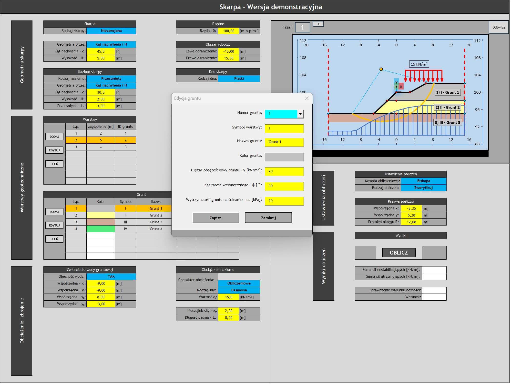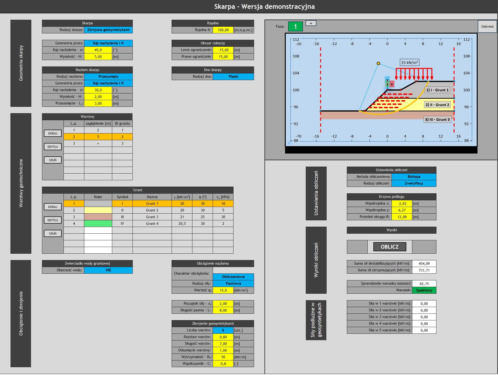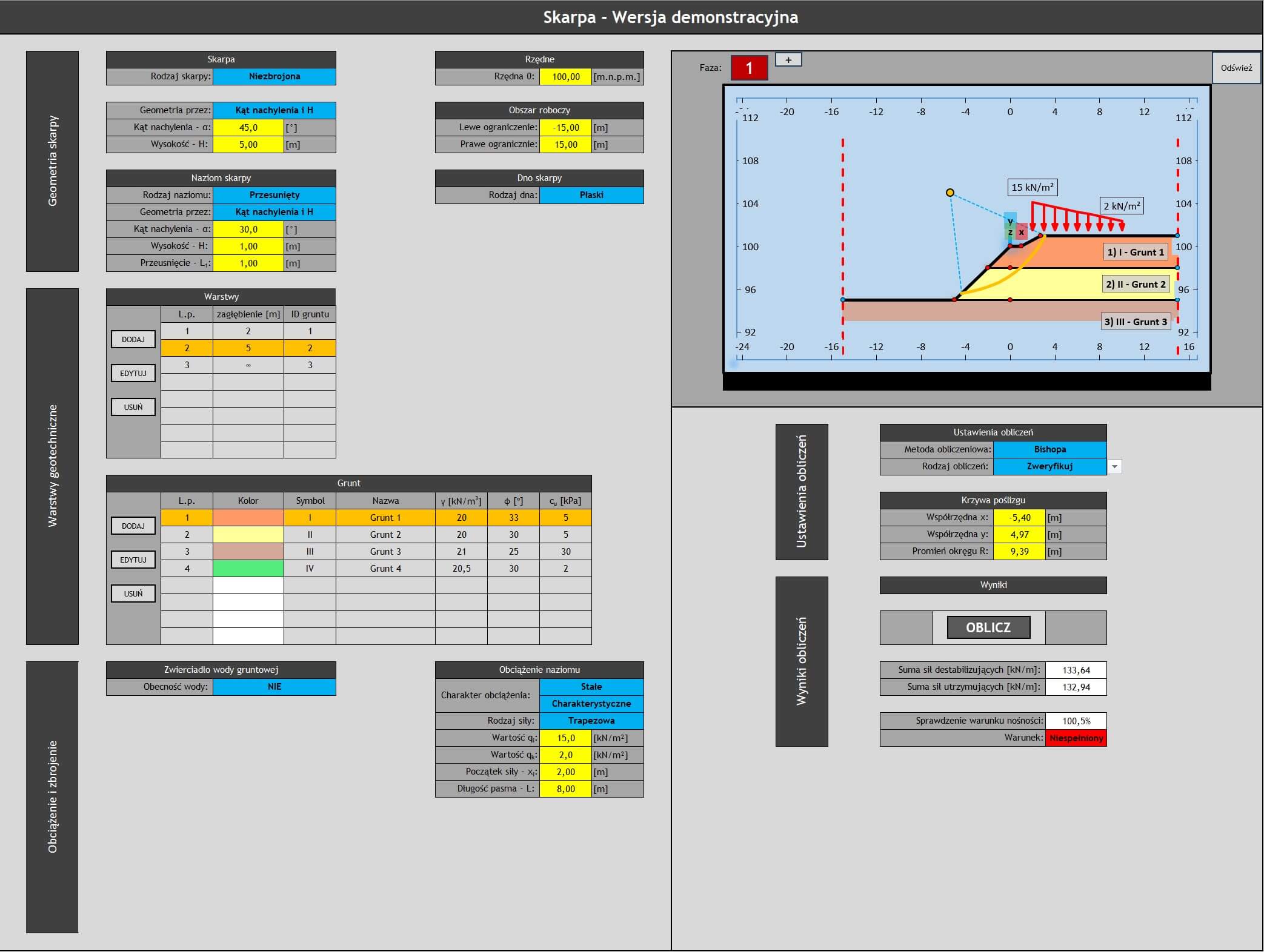 Program służy do przeprowadzania analizy stateczności skarpy w zależności od jej geometrii, obciążenia naziomu i warunków gruntowo-wodnych według normy PN-EN 1997 (Eurokod 7). Model obliczeniowy wprowadzany jest w sposób parametryczny, pozwalający na bardzo szybkie i przystępne modelowanie. Dostępna jest weryfikacja stateczności skarpy zwykłej (niezbrojonej), skarpy zabezpieczonej ścianą oporową oraz skarpy zbrojonej geosyntetykami. Program działa w środowisku Microsoft Excel. |
