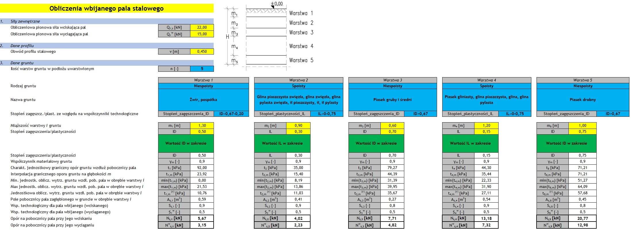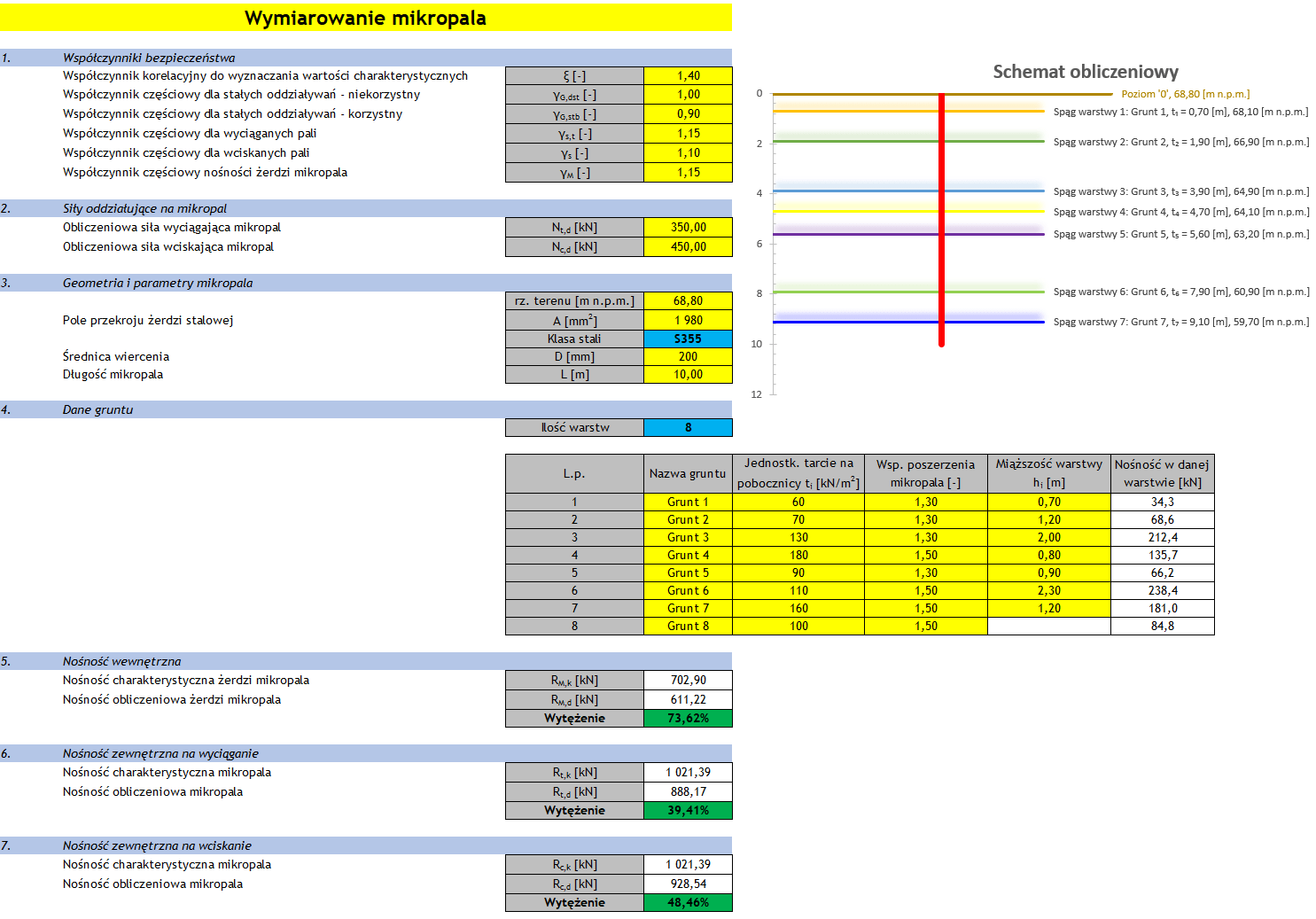 Program pozwala na zwymiarowanie mikropala według normy PN-EN 1997 (Eurokod 7). Użytkownik ma możliwość zadania do 8 warstw gruntu i obliczenie nośności zewnętrznej (ze względu na wyciąganie i wciskanie) oraz wewnętrznej elementu. Program działa w środowisku Microsoft Excel. |