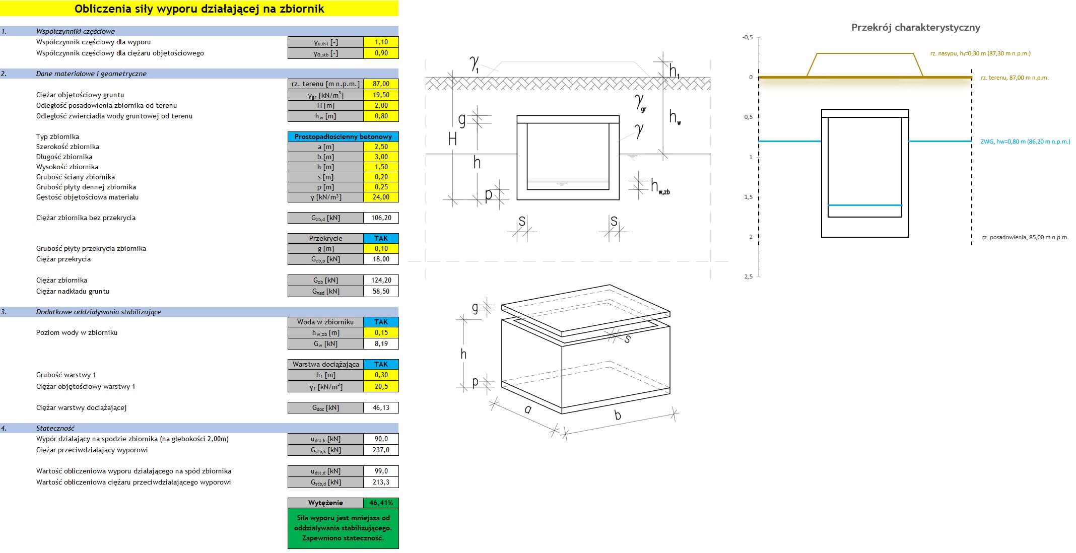 Program przeznaczony do obliczania parcia – siły wyporu – na przegrodę poziomą (element szczelny) lub zbiornik podziemny, w zależności od położenia zwierciadła wody gruntowej (ZWG). Program działa w środowisku Microsoft Excel. |