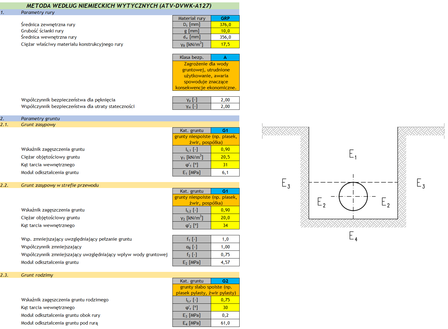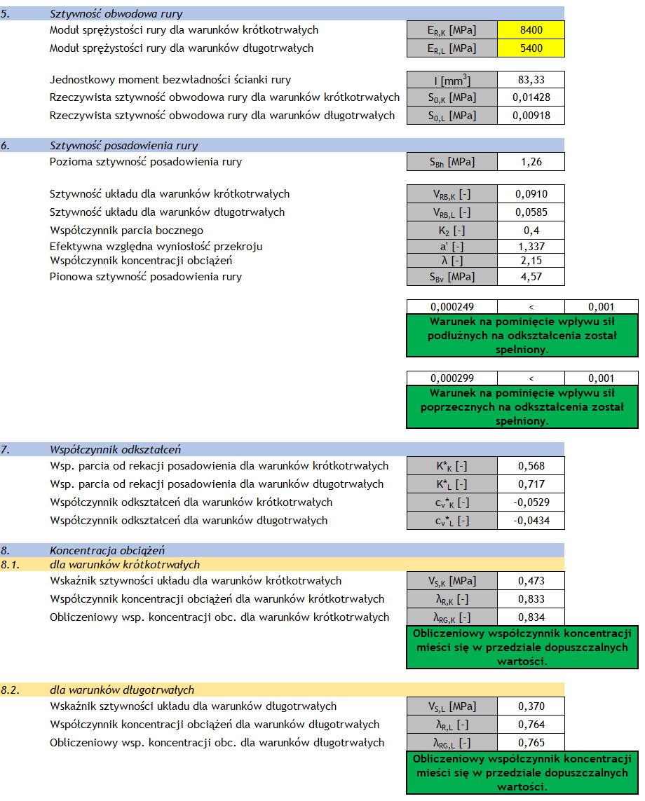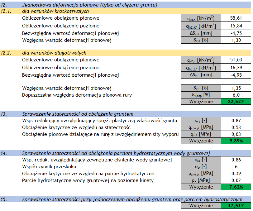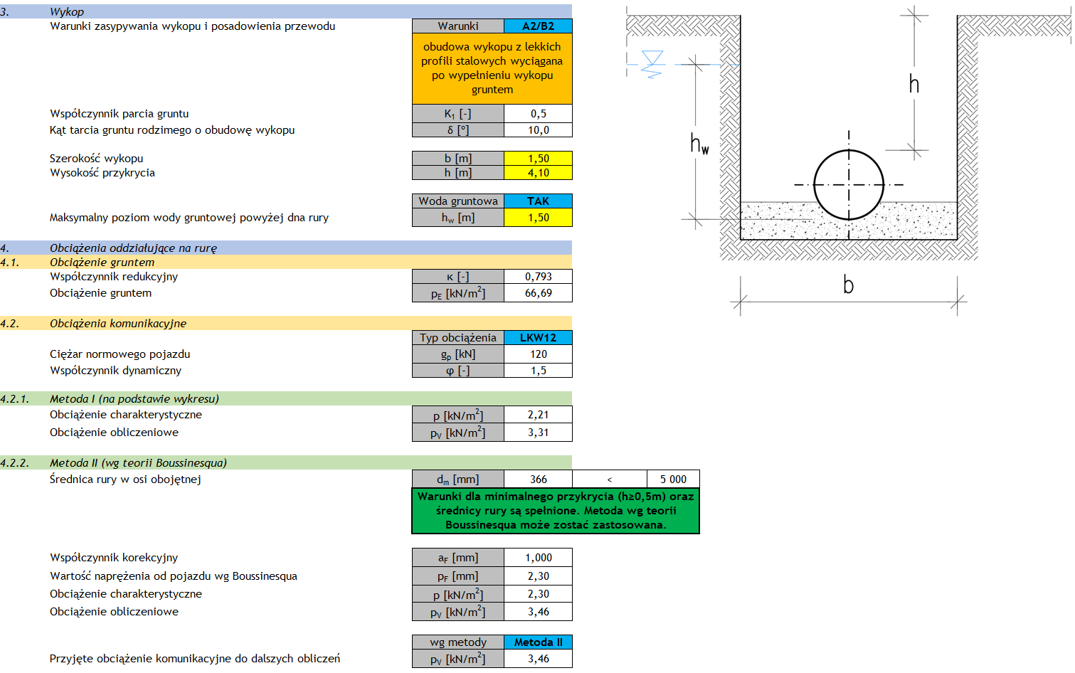 Program pozwala na zwymiarowanie rur podatnych z tworzyw sztucznych (HDPE, PVC, PP, GRP) ułożonych w gruncie ze względu, na dopuszczalne ugięcie i stateczność według wytycznych skandynawskich (Jansona J. E. oraz Molina J.) i niemieckich (ATV-DVWK-A127). Program działa w środowisku Microsoft Excel. |