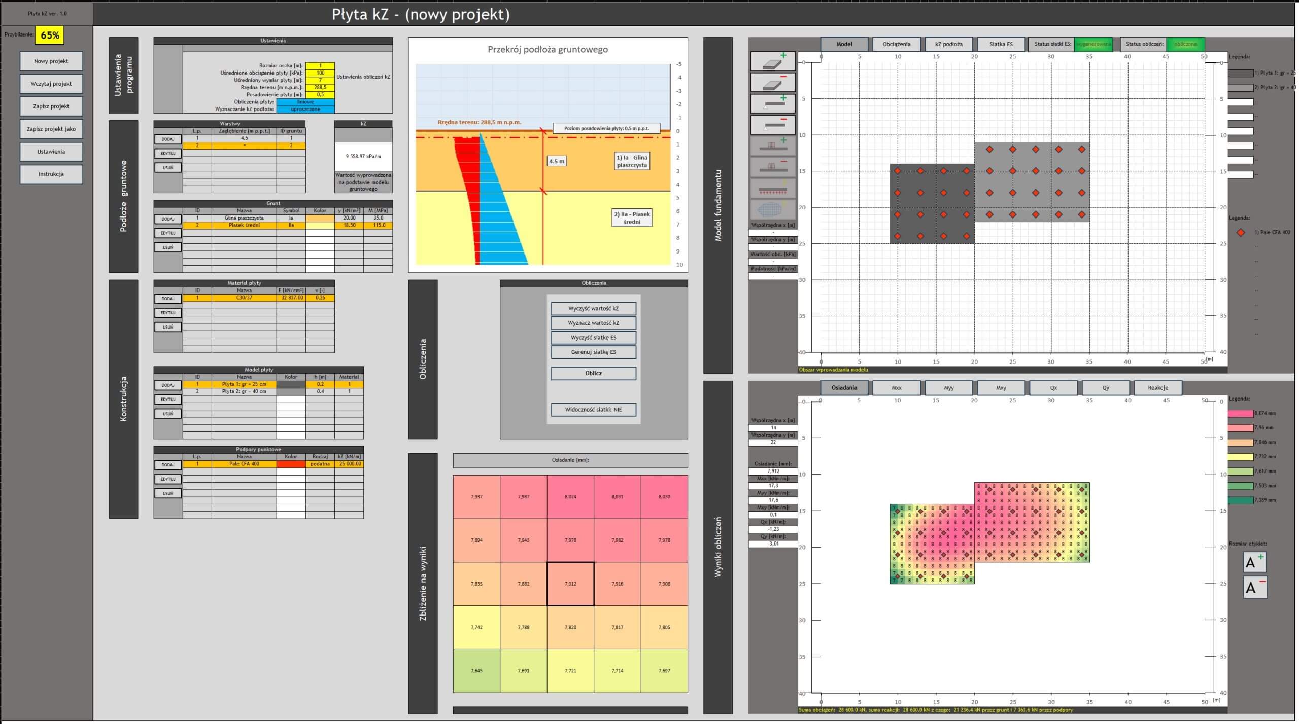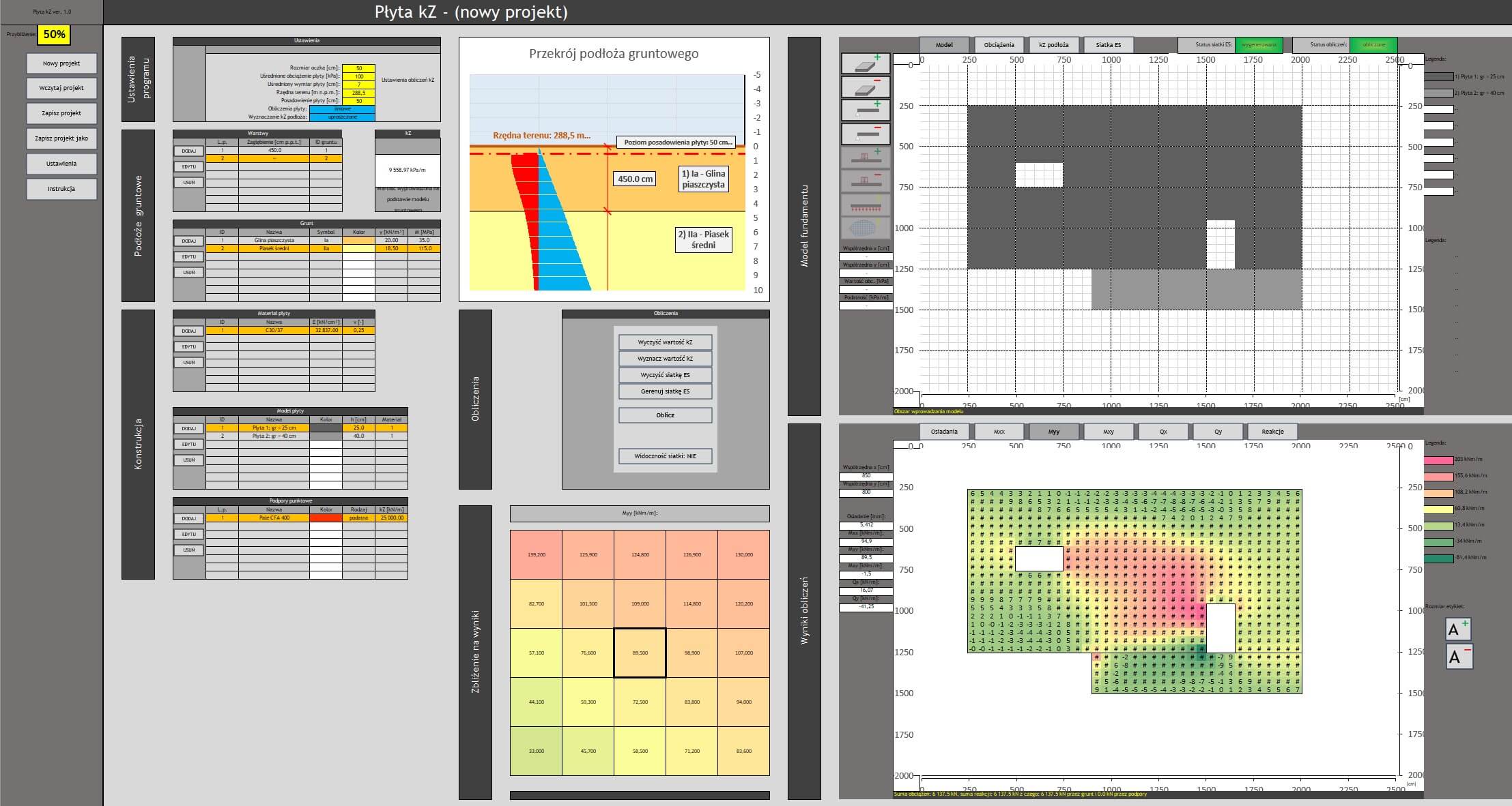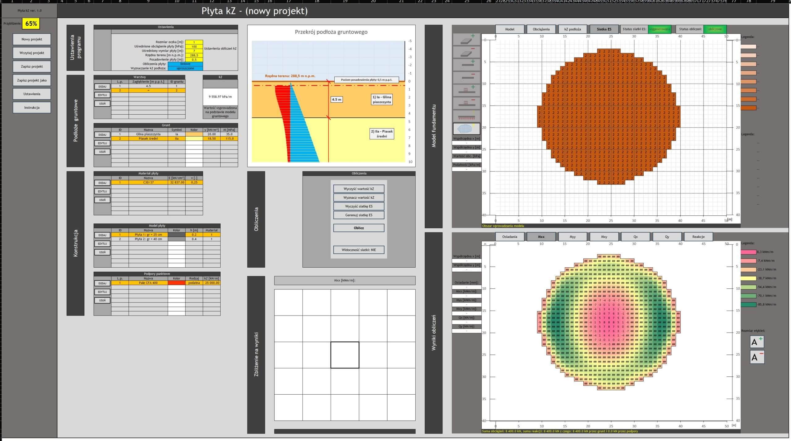 Program oparty na metodzie elementów skończonych (MES), pozwalający przeprowadzić analizę fundamentów posadowionych na podłożu sprężystym, w tym m.in. automatycznie obliczyć współczynniki podatności podłoża gruntowego kz w zależności od przyjętej geometrii i obciążeń konstrukcji. Program działa w środowisku Microsoft Excel. |
