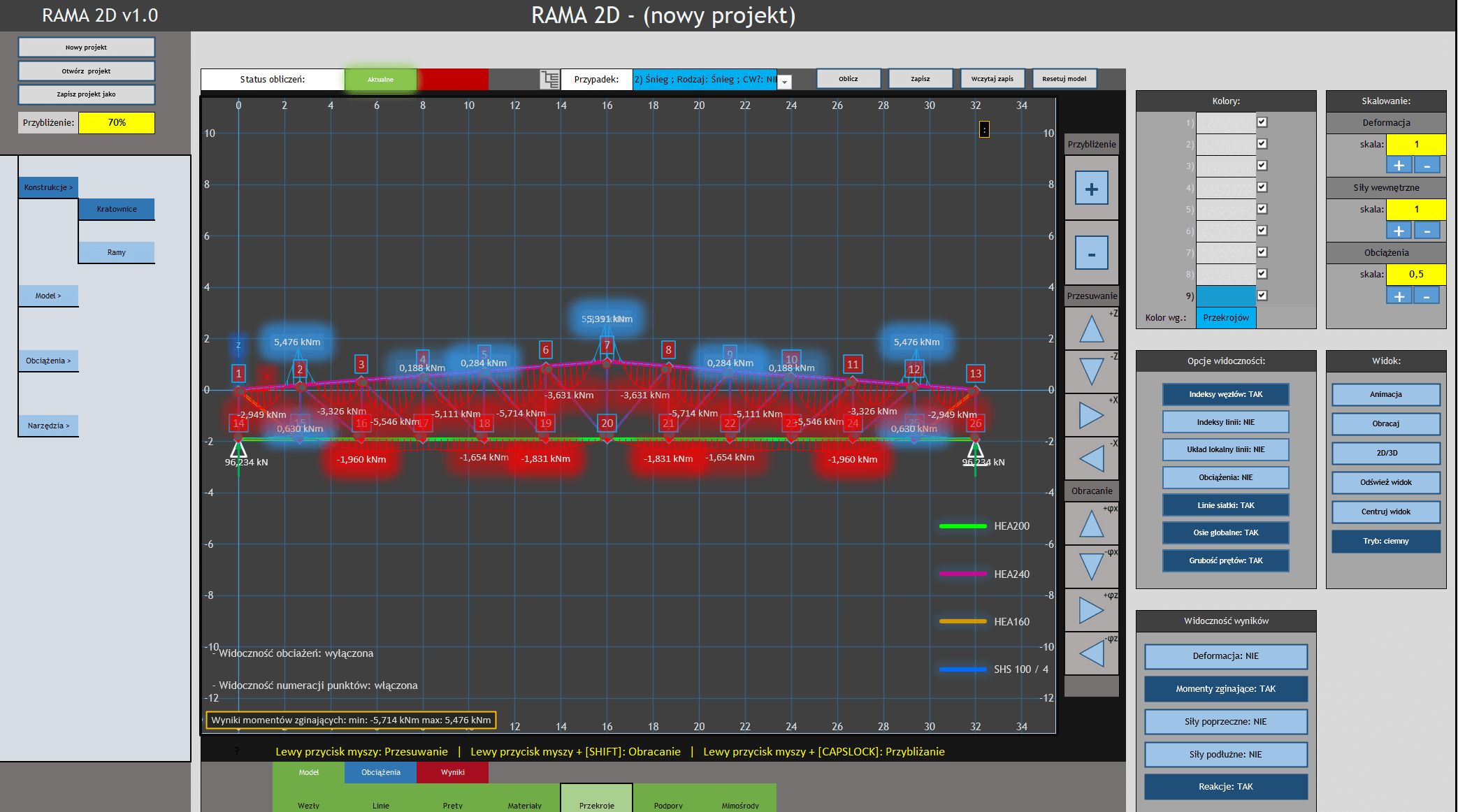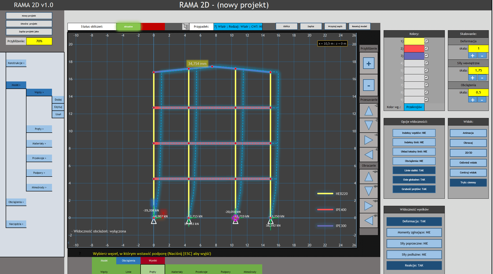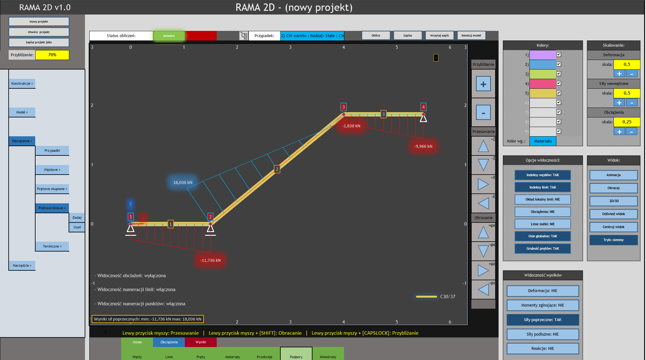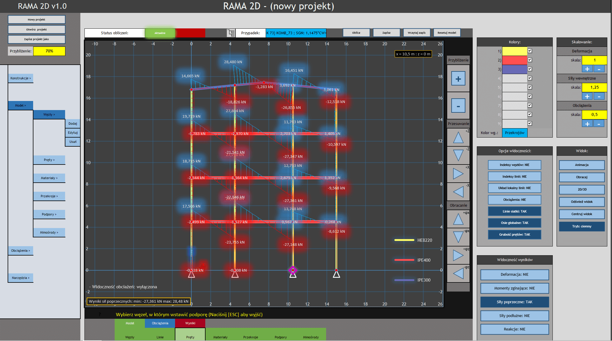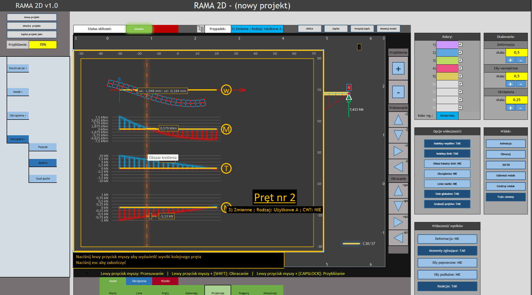 Program służy do zaawansowanej analizy statycznej płaskich ustrojów prętowych 2D w oparciu o metodę elementów skończonych (MES). Umożliwia Użytkownikowi przeprowadzenie obliczeń z uwzględnieniem automatycznej kombinatoryki oddziaływań zgodnie z Eurokodem EN 1990 lub kombinacji własnych. Modelowanie geometrii może odbywać się poprzez ręczne wprowadzanie węzłów i prętów oraz zaawansowane generowanie konstrukcji sparametryzowanych (kratownice i ramy). W programie zaimplementowano rozbudowane biblioteki profili stalowych, ale istnieje również opcja wprowadzania własnych przekrojów. Program działa w środowisku Microsoft Excel. |