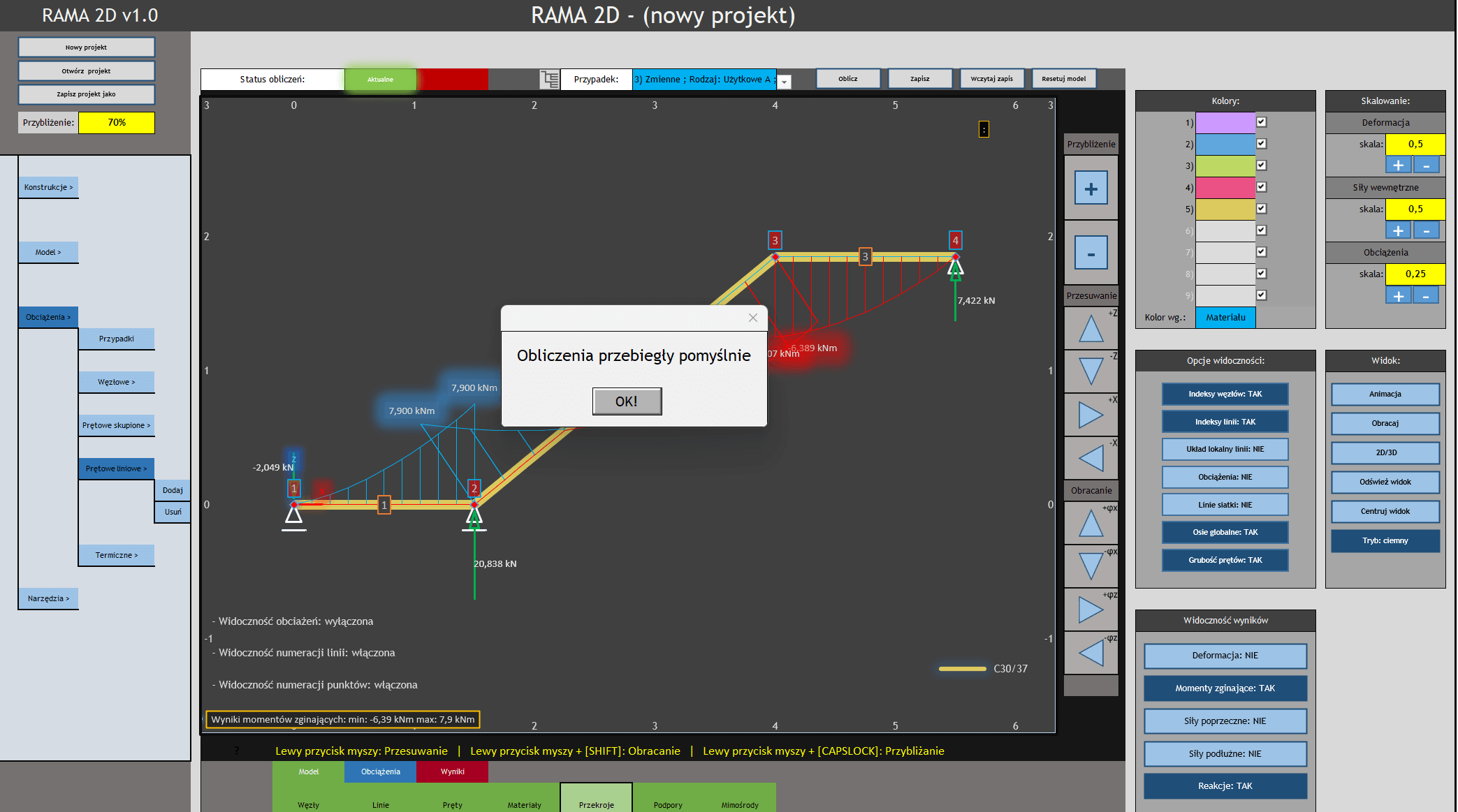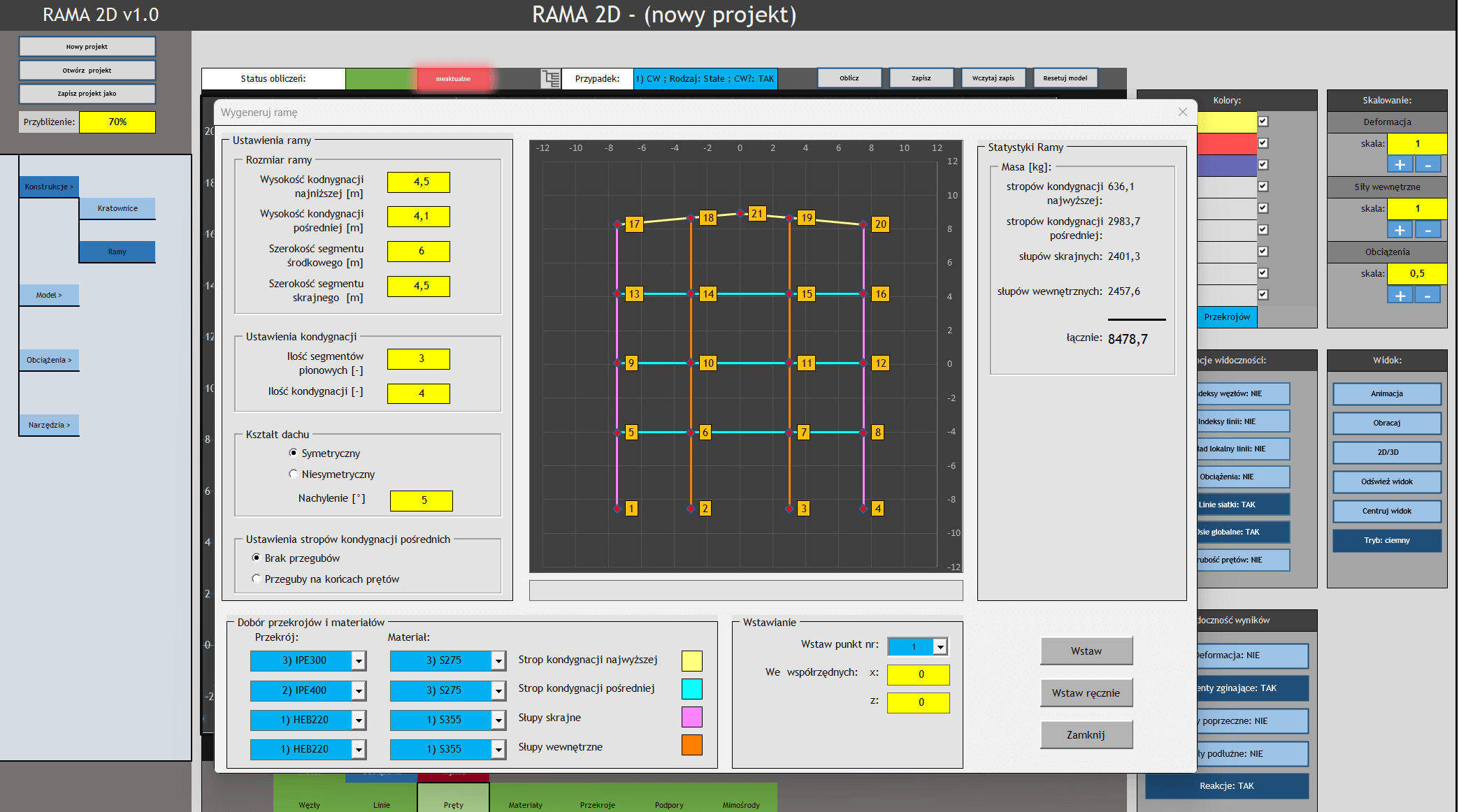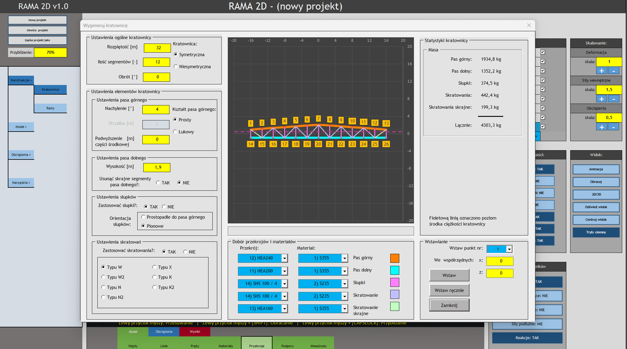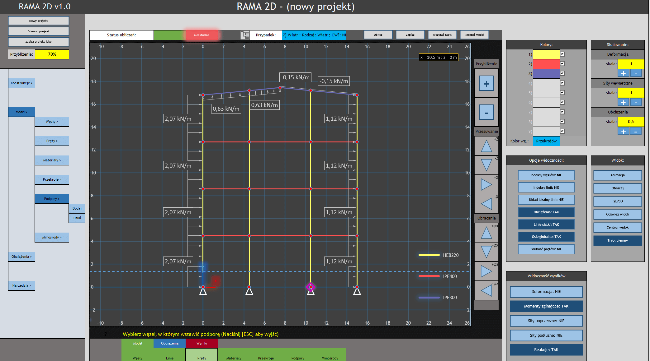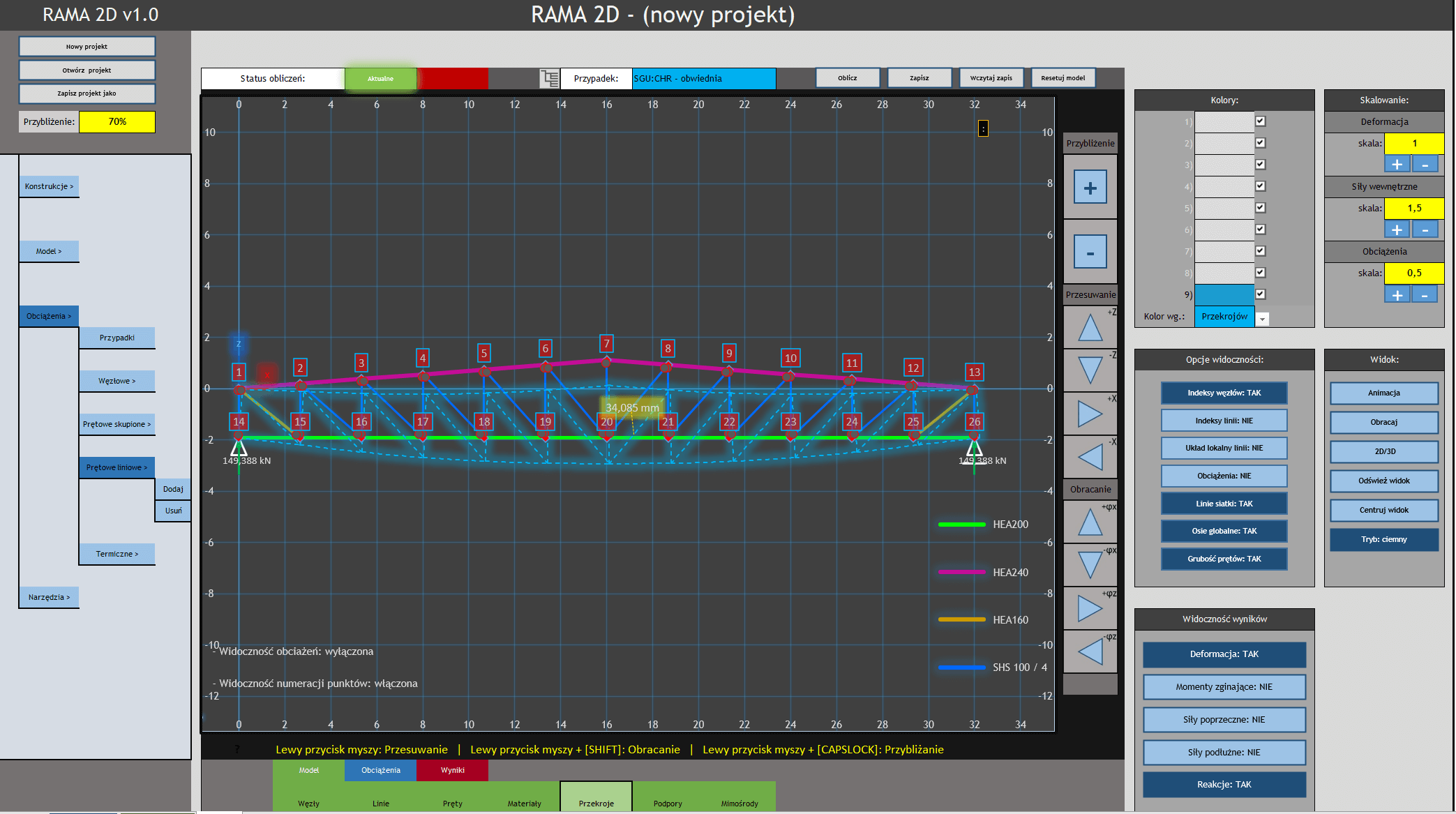 Program służy do zaawansowanej analizy statycznej płaskich ustrojów prętowych 2D w oparciu o metodę elementów skończonych (MES). Umożliwia Użytkownikowi przeprowadzenie obliczeń z uwzględnieniem automatycznej kombinatoryki oddziaływań zgodnie z Eurokodem EN 1990 lub kombinacji własnych. Modelowanie geometrii może odbywać się poprzez ręczne wprowadzanie węzłów i prętów oraz zaawansowane generowanie konstrukcji sparametryzowanych (kratownice i ramy). W programie zaimplementowano rozbudowane biblioteki profili stalowych, ale istnieje również opcja wprowadzania własnych przekrojów. Program działa w środowisku Microsoft Excel. |
