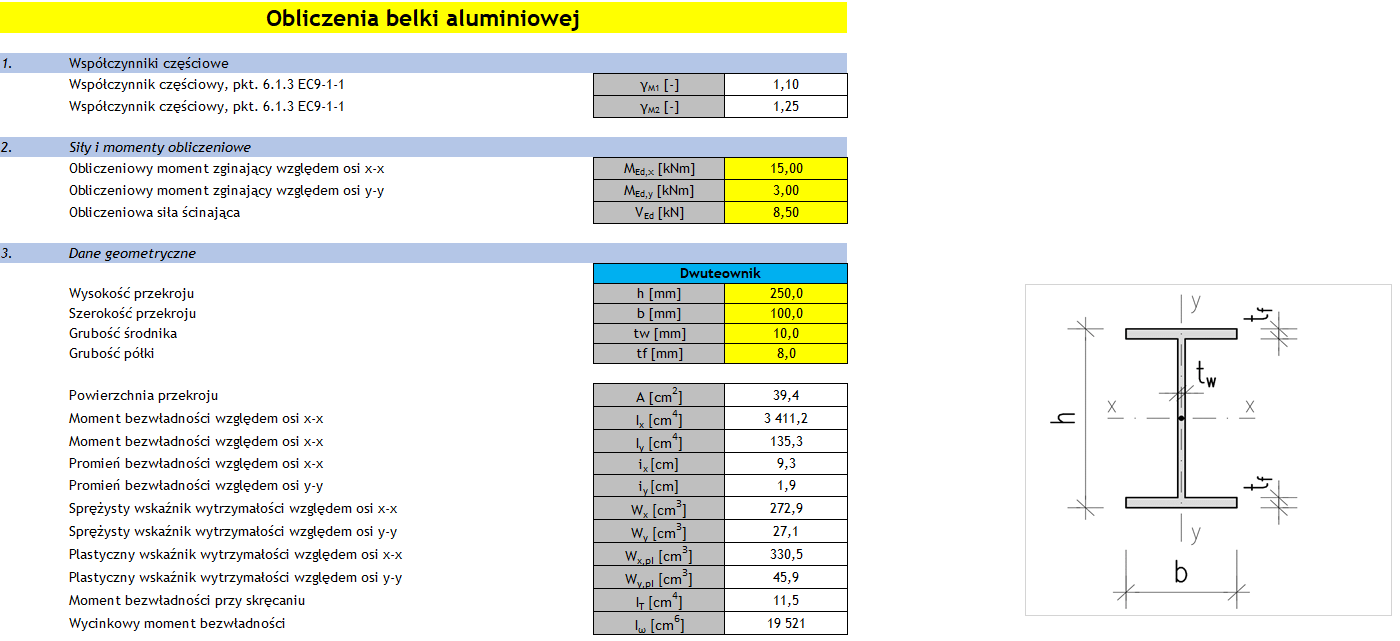 | belka aluminiowa kalkulatoryinzynierskie.pl | Program pozwala na pełne zwymiarowanie belki aluminiowej o następujących przekrojach: dwuteownik, ceownik, kątownik, teownik, rura prostokątna i rura okrągła wg normy PN-EN 1999-1-1 (Eurokod 9). Program działa w środowisku Microsoft Excel. |