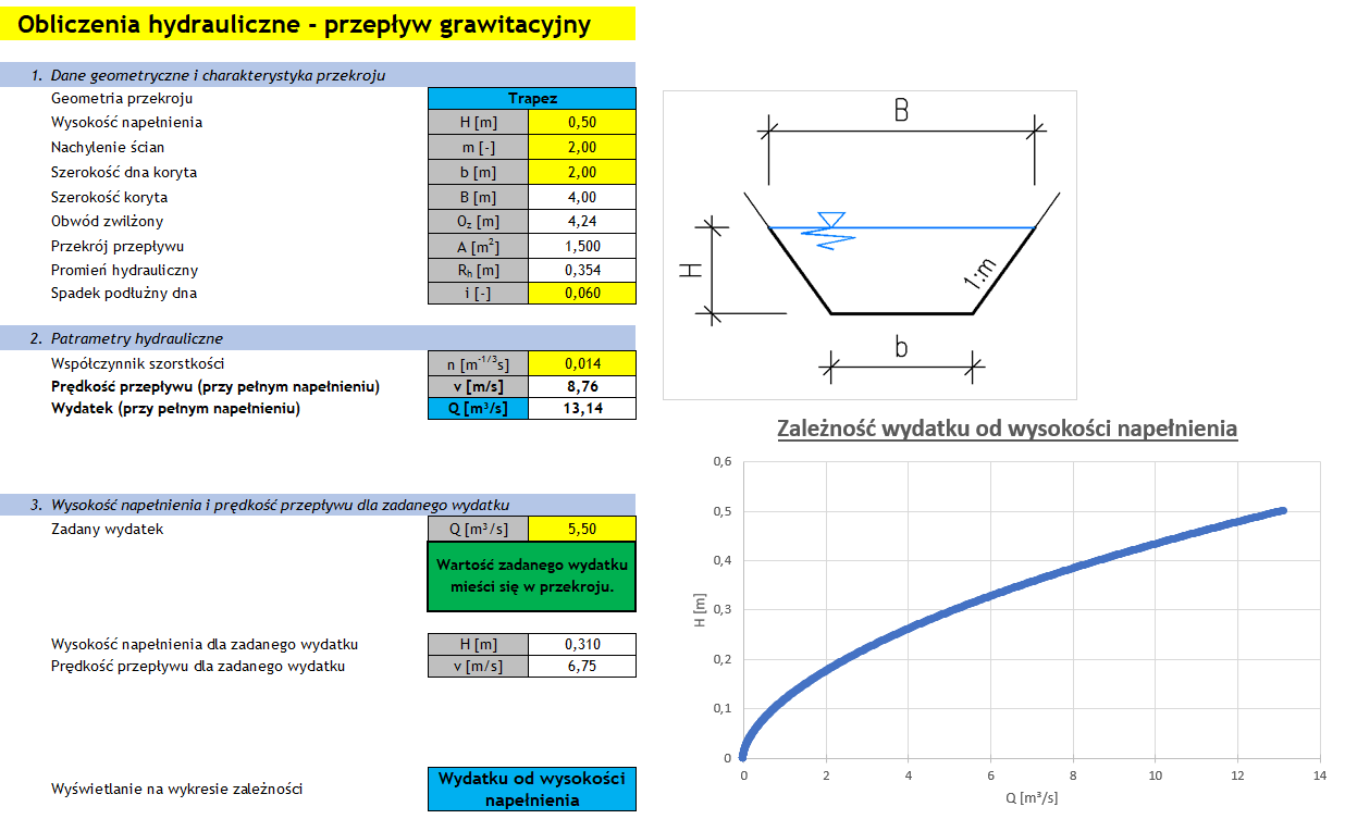 Program przeznaczony do obliczania parametrów hydraulicznych dla zadanego przekroju poprzecznego koryta: prostokątnego, trapezowego, trójkątnego, kołowego, przy przepływie grawitacyjnym (bezciśnieniowym). Program działa w środowisku Microsoft Excel. |