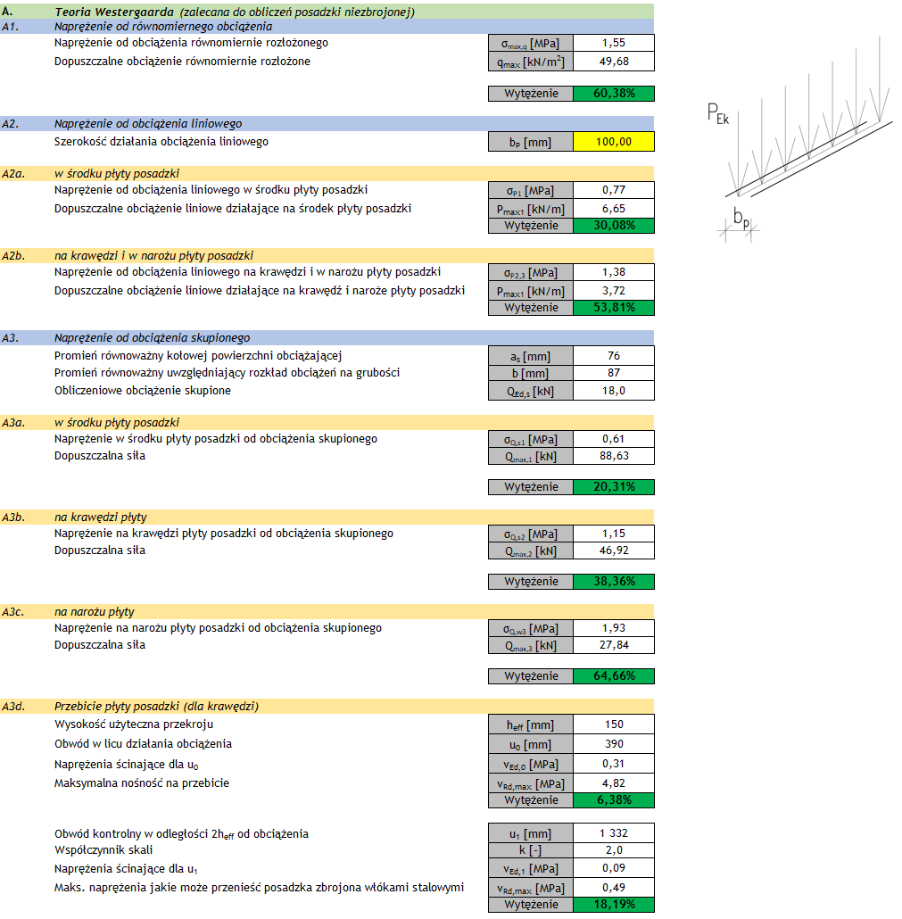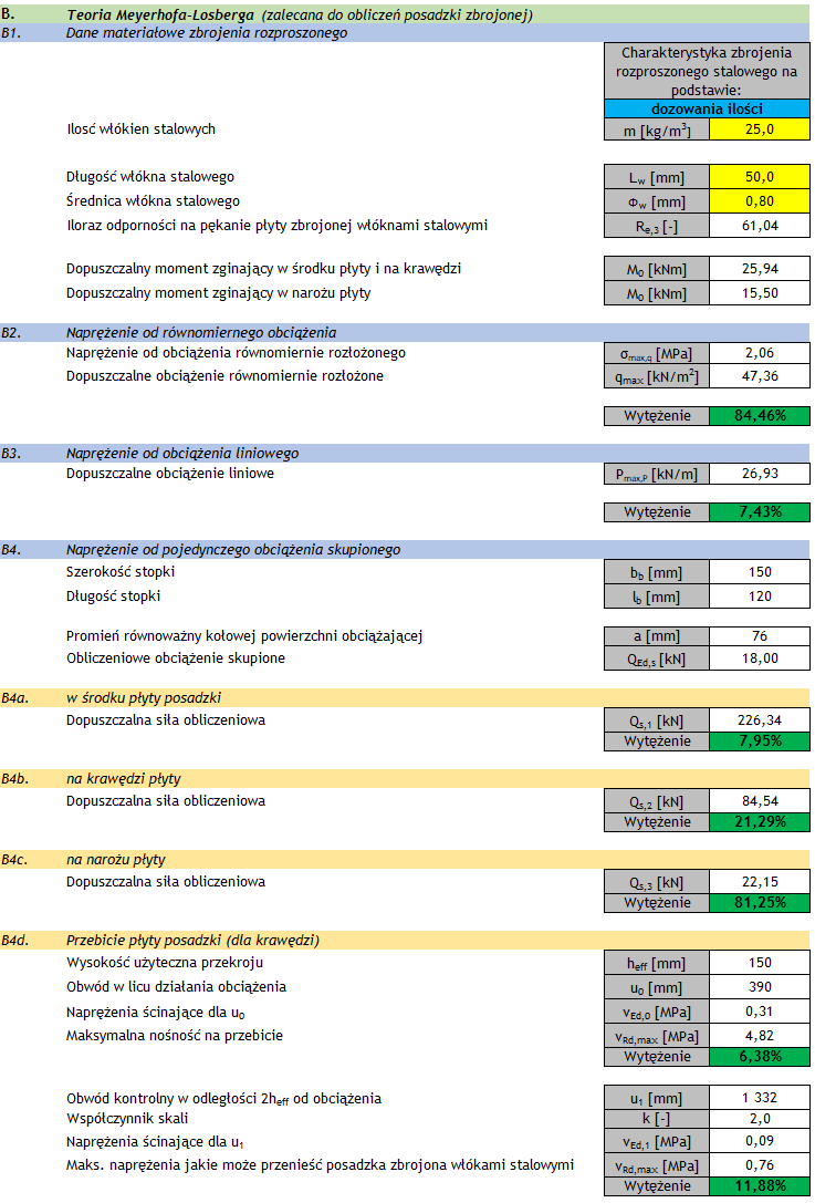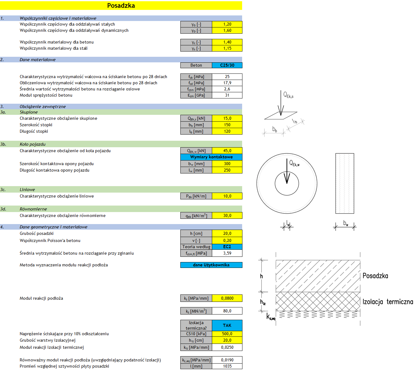 Program pozwala na zwymiarowanie posadzki betonowej lub zbrojonej stalowym włóknem rozproszonym zgodnie z teoriami Westergaarda, Meyerhofa-Losberga oraz Hetenyi, w oparciu o normę PN-EN 1992-1-1 (EC2) i wytyczne brytyjskie TR34. Użytkownik ma możliwość wprowadzenia oddziaływań zewnętrznych: obciążenie skupione, obciążenie kołem pojazdu (powierzchnia lub ciśnienie kontaktowe), obciążenie liniowe i obciążenie równomierne. Dla usprawnienia obliczeń, program zawiera dodatkowo kalkulator do wyznaczania podatności podłoża kz. Program działa w środowisku Microsoft Excel. |
