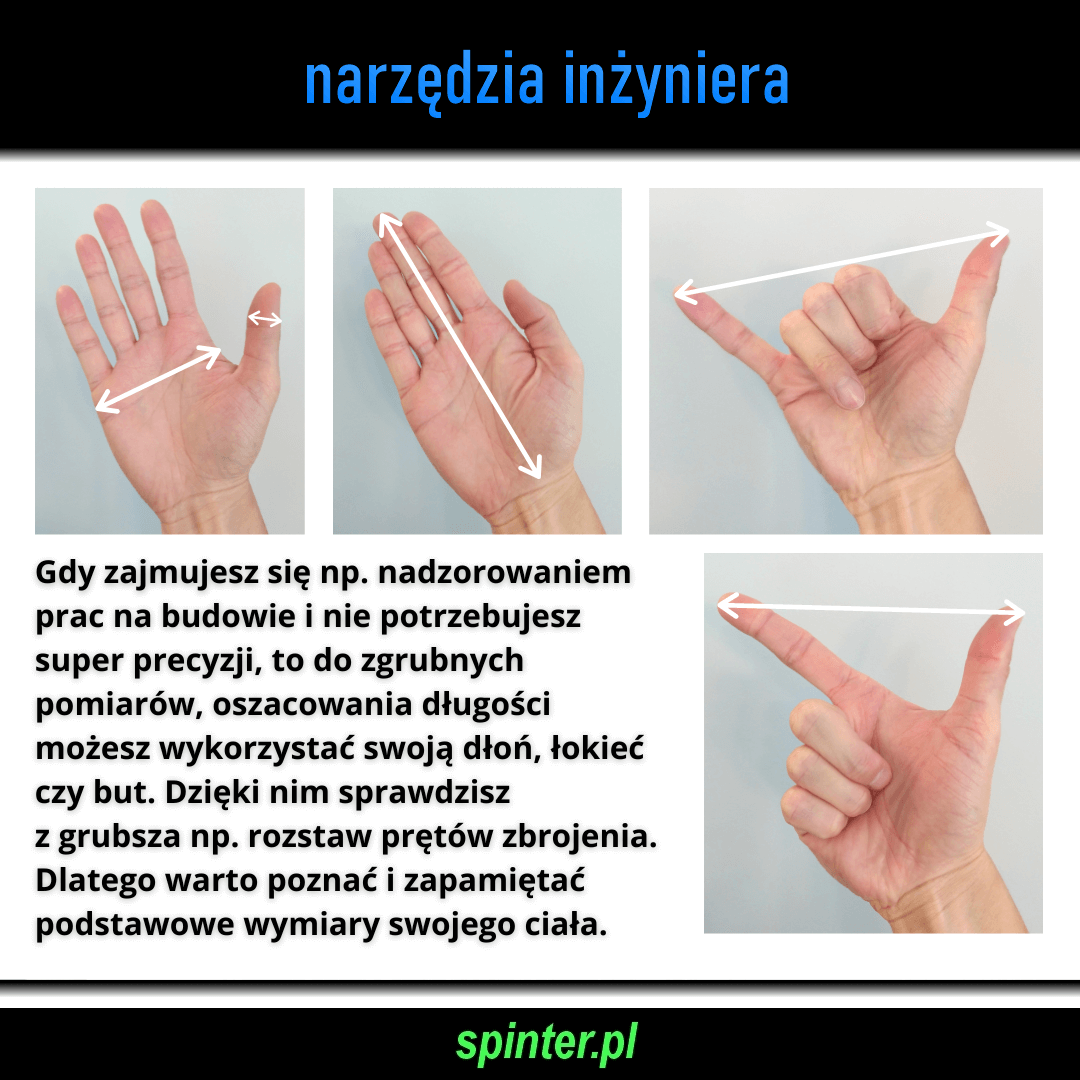 Gdy zajmujesz się np. nadzorowaniem prac na budowie i nie potrzebujesz super precyzji, to do zgrubnych pomiarów, oszacowania długości możesz wykorzystać swoją dłoń, łokieć czy but. Dzięki nim sprawdzisz z grubsza np. rozstaw prętów zbrojenia.