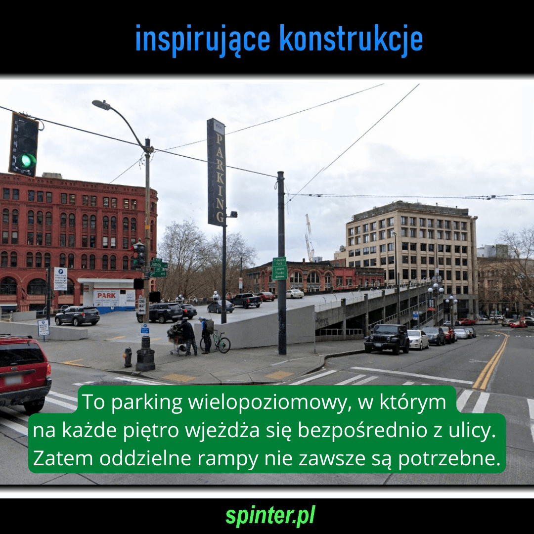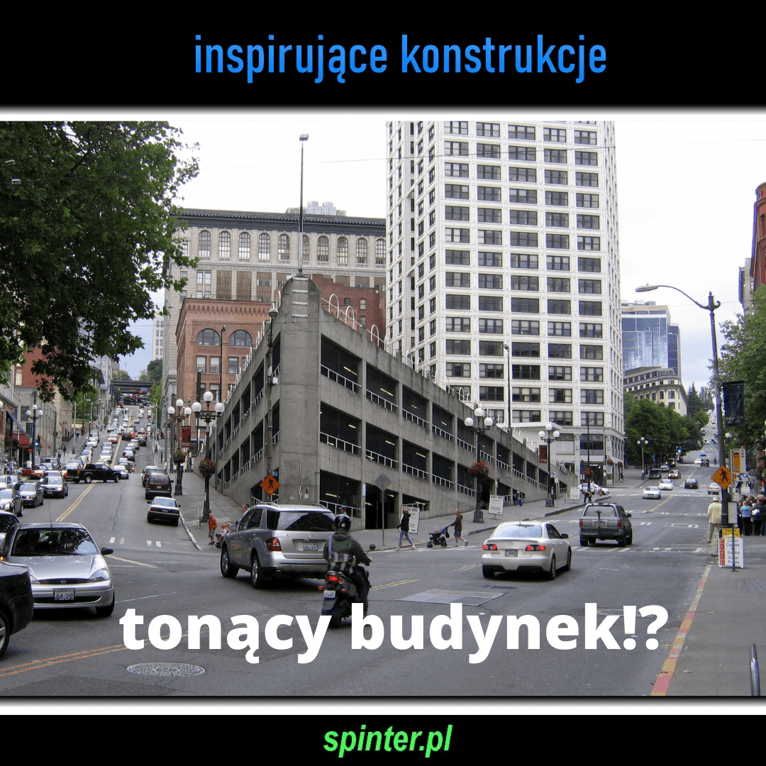 Tonący budynek!? Nie, to parking wielopoziomowy w centrum Seattle w USA, na skrzyżowaniu ulic Yesler Way, James St i 2nd Ave. Budynek wygląda jakby częściowo zapadł się pod ziemię. W tym garażu płyty postojowe są pochylone i zrezygnowano całkowicie z tradycyjnych ramp. Wjazd na każde piętro odbywa się bezpośrednio z ulicy.