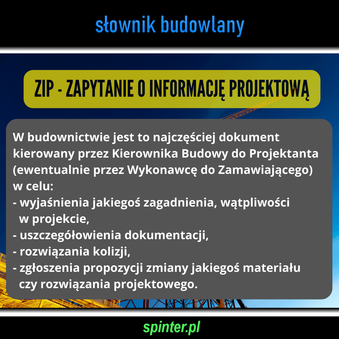 W budownictwie ZIP jest to najczęściej dokument kierowany przez Kierownika Budowy do Projektanta (ewentualnie przez Wykonawcę do Zamawiającego) w celu: – wyjaśnienia jakiegoś zagadnienia, wątpliwości w projekcie, – uszczegółowienie dokumentacji, – rozwiązanie kolizji, – zgłoszenie propozycji zmiany jakiegoś materiału czy rozwiązania projektowego.