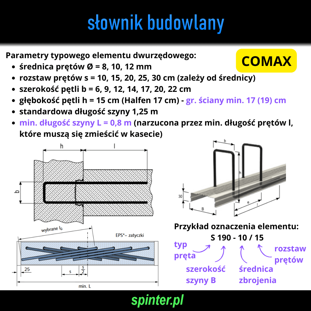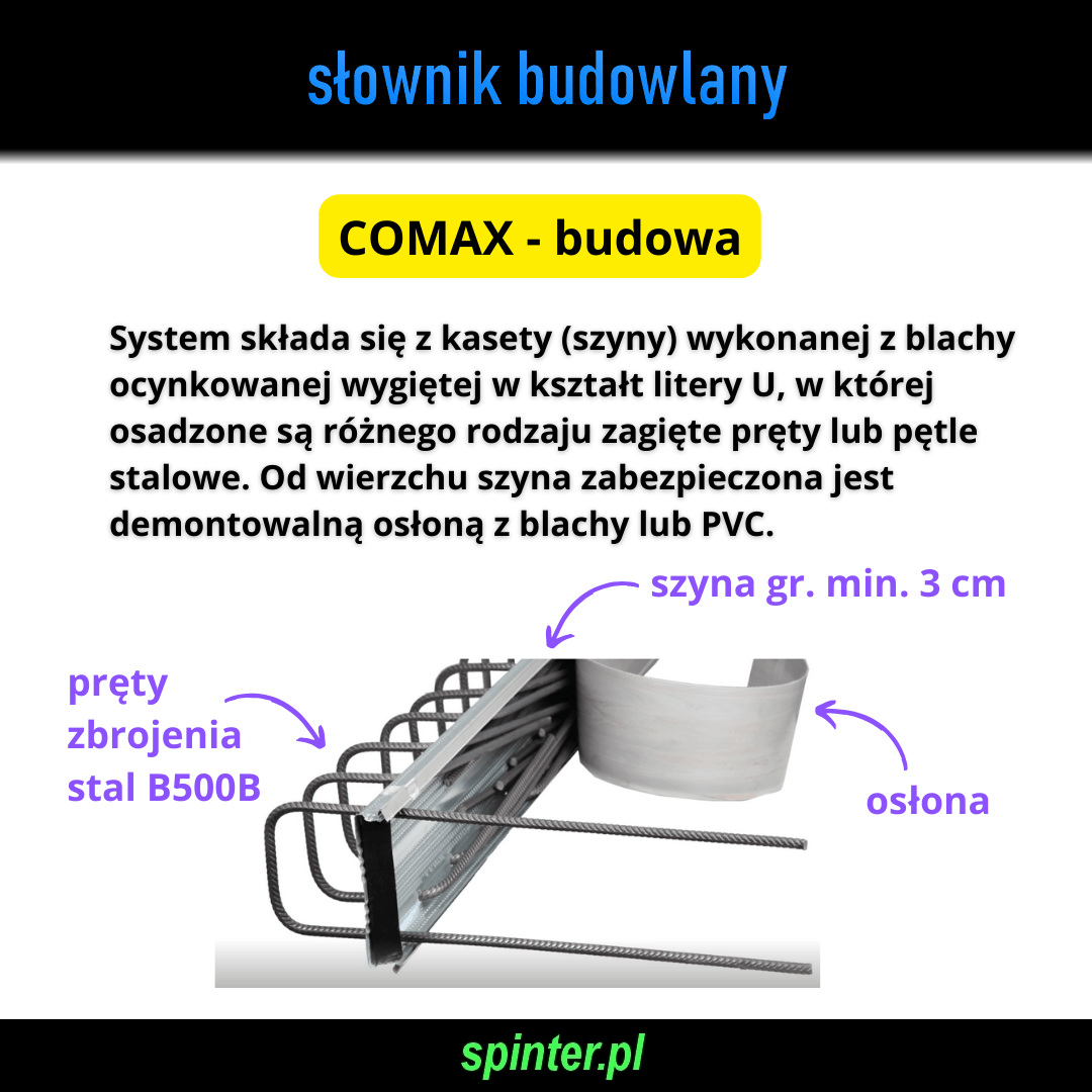COMAX – budowa: System składa się z kasety (szyny) gr. min. 3 cm wykonywanej z blachy ocynkowanej wygiętej w kształt litery U, w której osadzone są różnego rodzaju zagięte pręty lub pętle ze stali B500B. Od wierzchu szyna zabezpieczona jest demontowalną osłoną z blachy lub PVC.