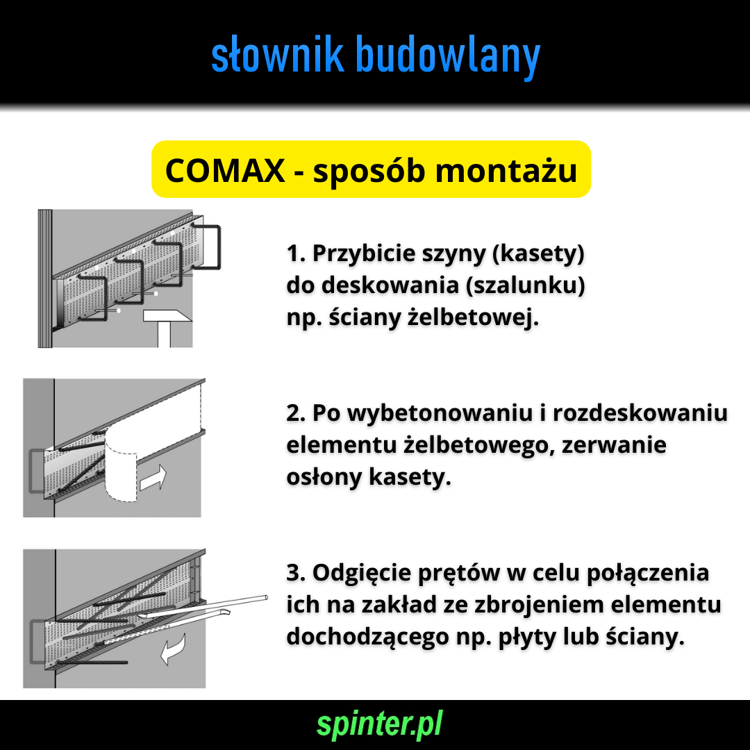 COMAX – sposób montażu: 1. Przybicie szyny (kasety) do deskowania (szalunku) np. ściany żelbetowej. 2. Po wybetonowaniu i rozdeskowaniu elementu żelbetowego, zerwanie osłony kasety. 3. Odgięcie prętów w celu połączenia ich na zakład ze zbrojeniem elementu dochodzącego np. płyty lub ściany.