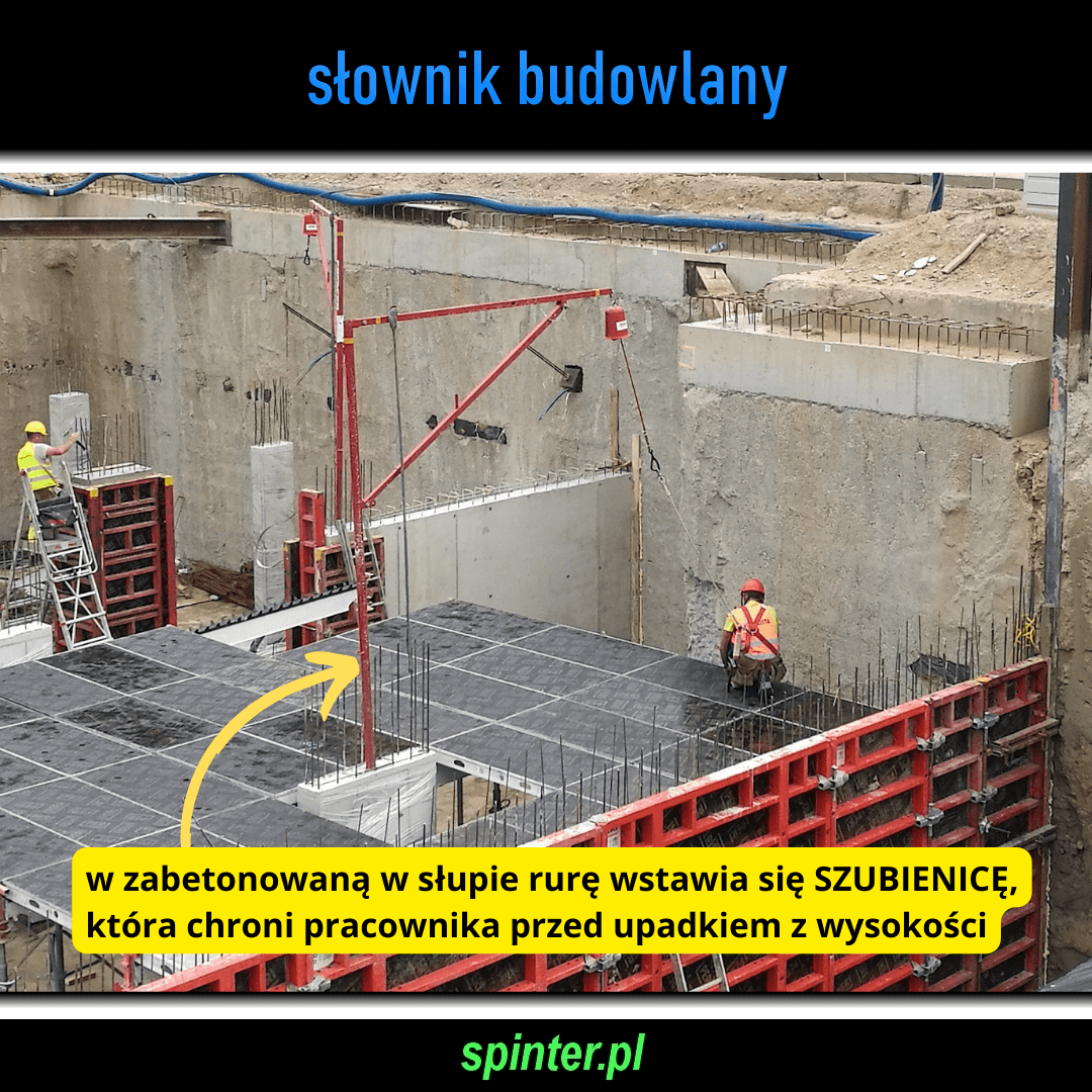 W zabetonowaną w słupie rurę wstawia się szubienicę, która chroni pracownika przed upadkiem z wysokości.