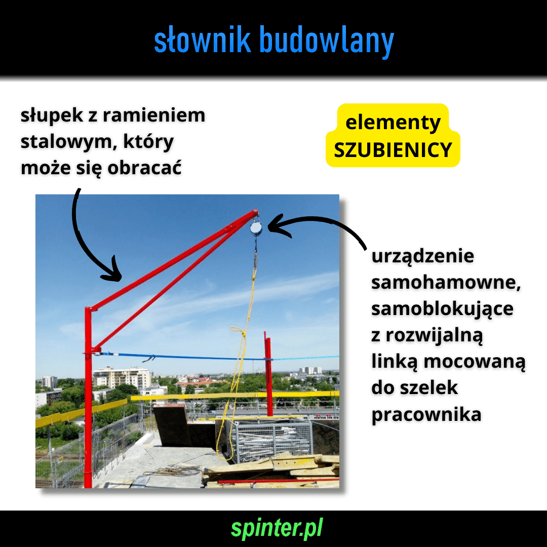 Szubienica składa się ze słupka z ramieniem stalowym, który może się obracać. Na końcu wysięgnika zawieszone jest urządzenie samohamowne, samoblokujące z rozwijalną linką mocowaną do szelek pracownika.