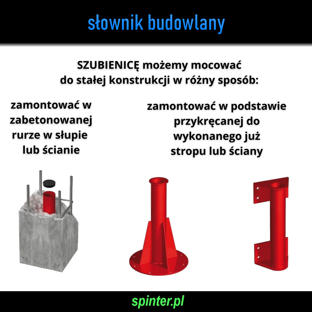 Szubienicę możemy mocować w różny sposób: – zamontować w zabetonowanej rurze w słupie lub ścianie, – zamontować w podstawie przykręcanej do wykonanego już stropu lub ściany, – zamontować do mobilnej, przestawnej podstawy z ciężkim balastem.