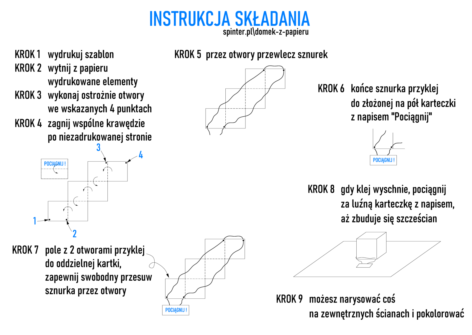 Sposób nr 2 – bardziej czasochłonny: Wydrukuj czysty szablon sześcianu na kartce A4, wytnij oraz złóż wg instrukcji poniżej, następnie samodzielnie narysuj wszystkie elementy domu (pobierz szablon).