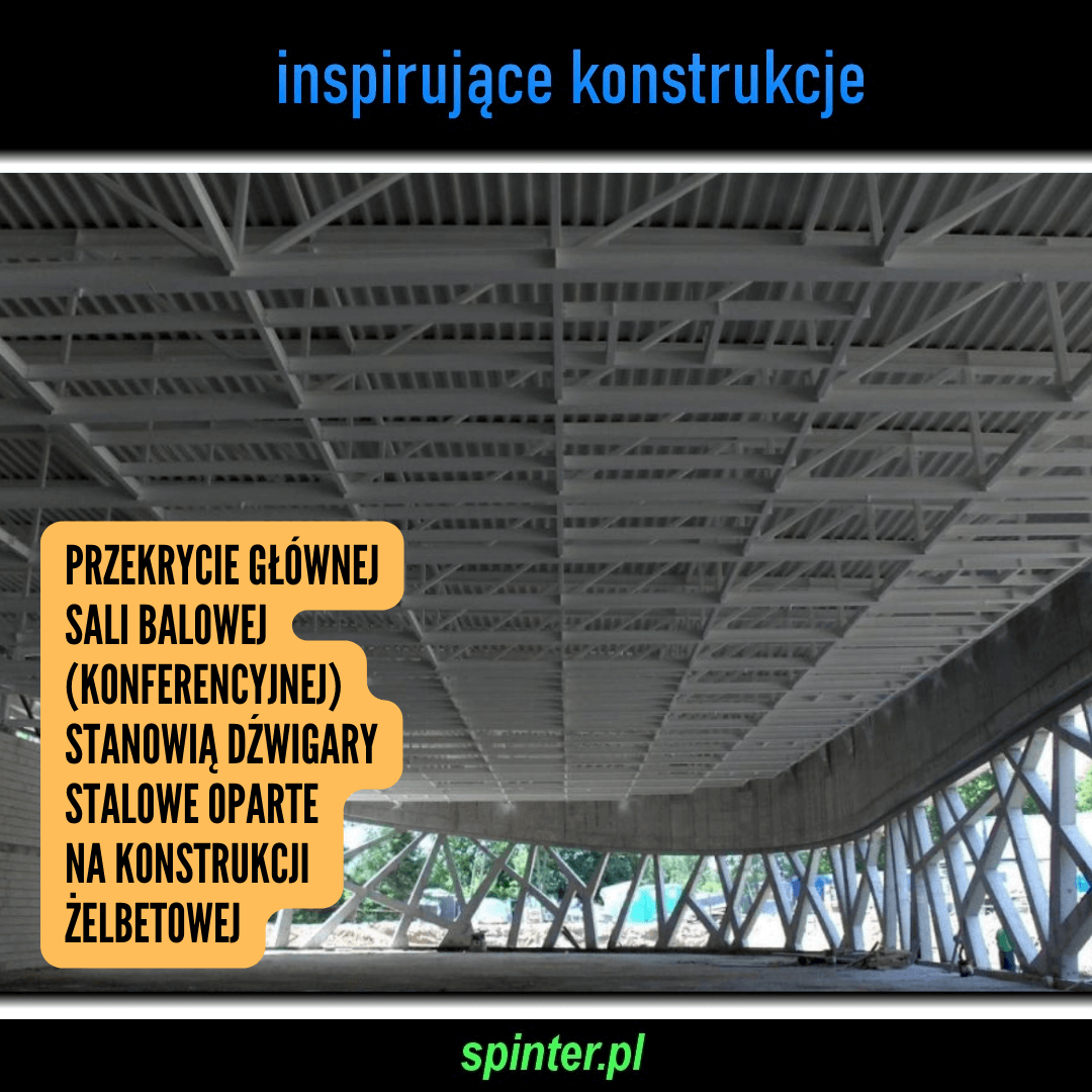 Konstrukcja żelbetowa, monolityczna, częściowo tarczowa, częściowo słupowo-płytowa. Przekrycie głównej sali balowej (konferencyjnej) stanowią dźwigary stalowe oparte na konstrukcji żelbetowej. Antresola została podwieszona na wieszakach do konstrukcji powyżej, aby w holu wejściowym ograniczyć ilość podpór.