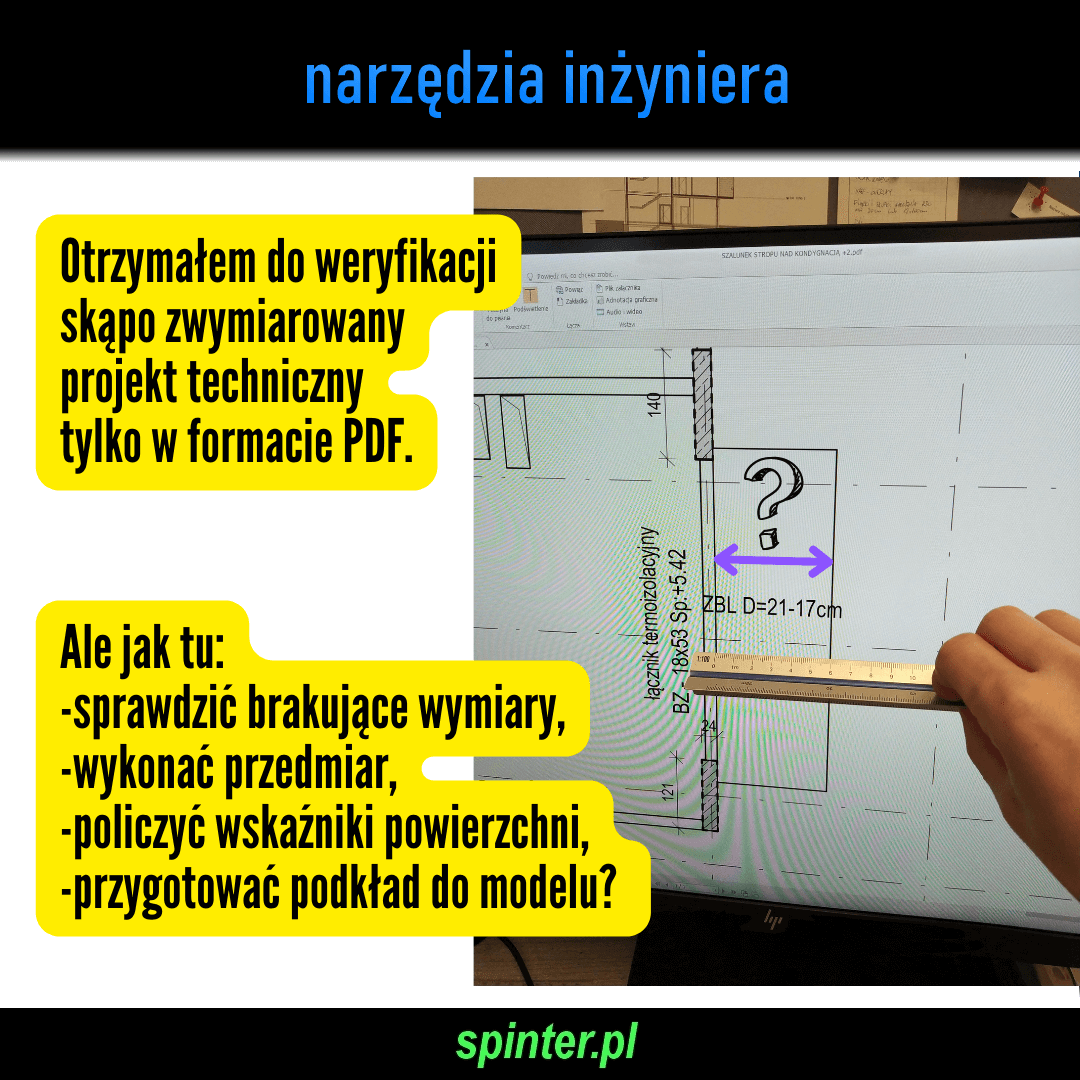 Otrzymałem do weryfikacji skąpo zwymiarowany projekt techniczny, tylko w formacie PDF. Ale jak tu: – sprawdzić brakujące wymiary, – wykonać przedmiar, – policzyć wskaźniki powierzchni, – przygotować podkład do modelu?