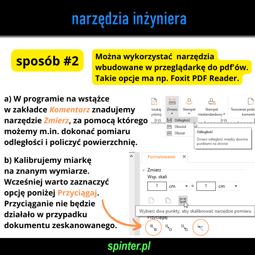 Sposób #2 Można wykorzystać narzędzia wbudowane w przeglądarkę do PDF’ów. Takie opcje ma np. Foxit PDF Reader. a) W programie na wstążce w zakładce Komentarz znajdujemy narzędzie Zmierz, za pomocą którego możemy m.in. dokonać pomiaru odległości i policzyć powierzchnię. b) Kalibrujemy miarkę na znanym wymiarze np. słupa. Wcześniej warto zaznaczyć opcję poniżej Przyciągaj (przyciąganie nie będzie działało w przypadku dokumentu zeskanowanego). c) Po wskazaniu dwóch dowolnych punktów na rysunku otrzymamy szukany wymiar.