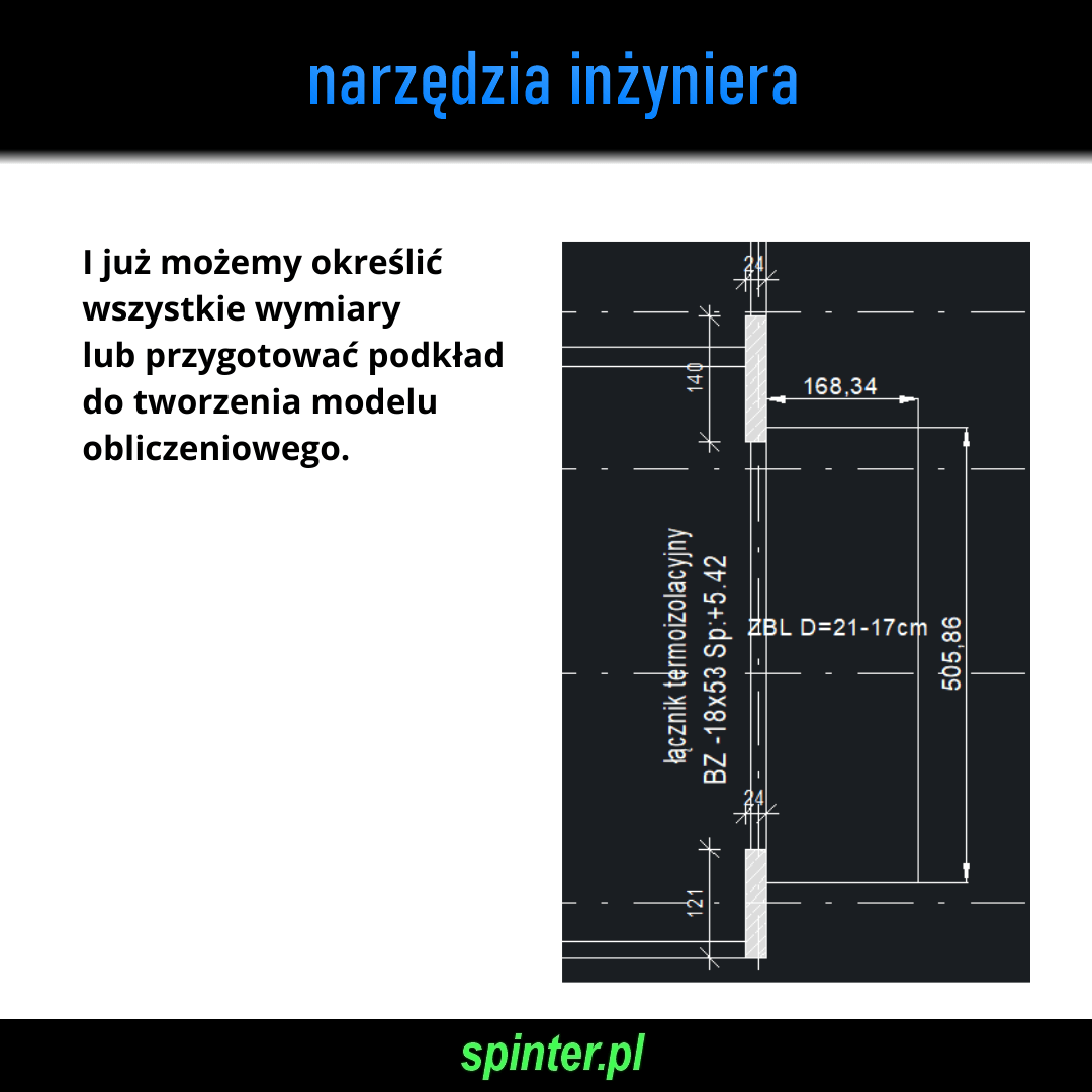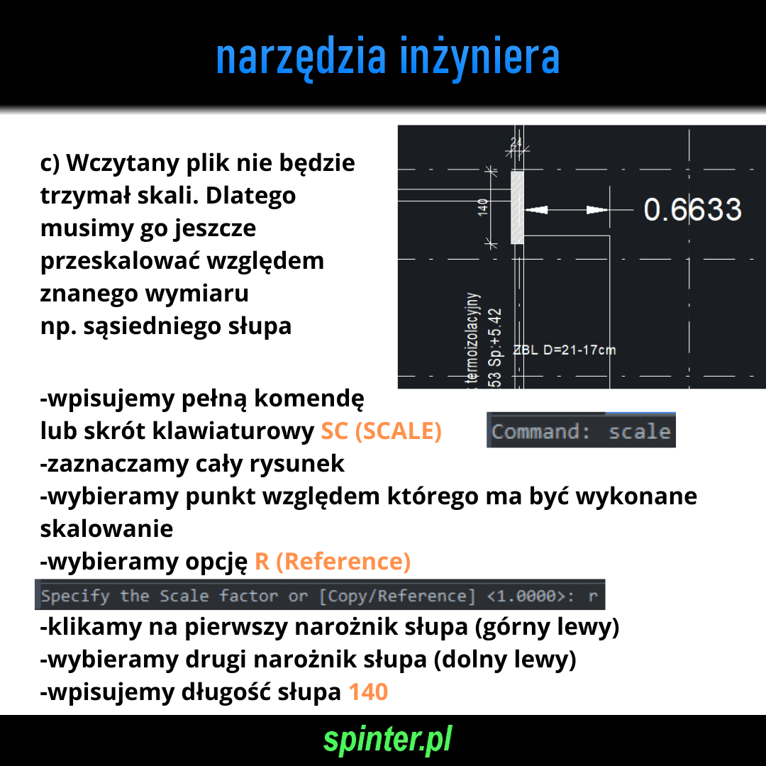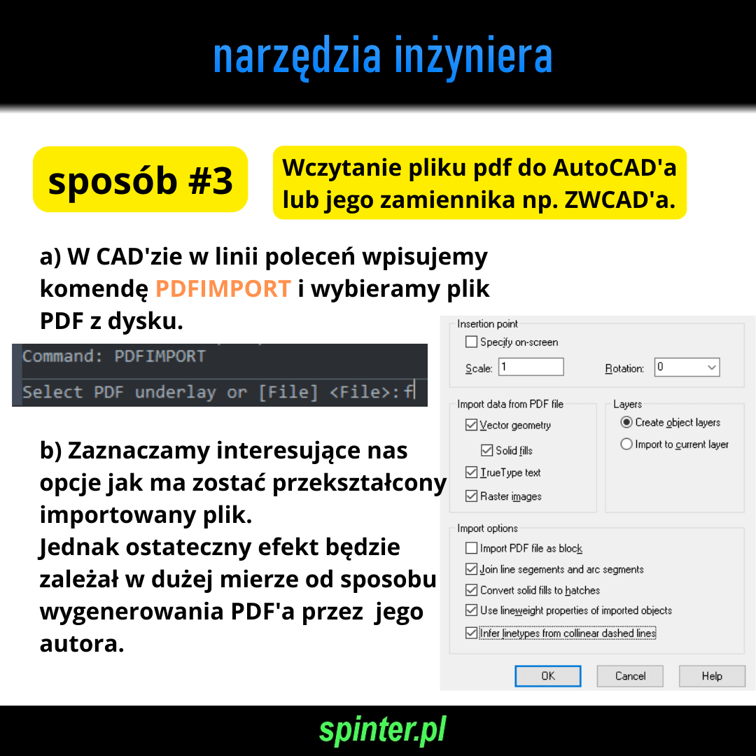 Sposób #3 Wczytanie pliku PDF do AutoCAD’a lub jakiegoś zamiennika np. ZWCAD’a. a) W CAD’zie w linii poleceń wpisujemy komendę PDFIMPORT i wybieramy plik PDF z dysku. b) Zaznaczamy interesujące nas opcje jak ma zostać przekształcony importowany plik. Jednak ostateczny efekt będzie zależał w dużej mierze od sposobu wygenerowania PDF’a przez jego autora. c) Wczytany plik nie będzie trzymał skali. Dlatego musimy go jeszcze przeskalować względem znanego wymiaru np. sąsiedniego słupa. – wpisujemy pełną komendę lub skrót klawiaturowy SC (SCALE) – zaznaczamy cały rysunek – wybieramy punkt względem którego ma być wykonane skalowanie – wybieramy opcję R (Reference) – klikamy na pierwszy narożnik słupa (górny lewy) – wybieramy drugi narożnik słupa (dolny lewy) – wpisujemy długość słupa, w tym przypadku 140 I już możemy określić wszystkie wymiary lub przygotować podkład do utworzenia modelu obliczeniowego.