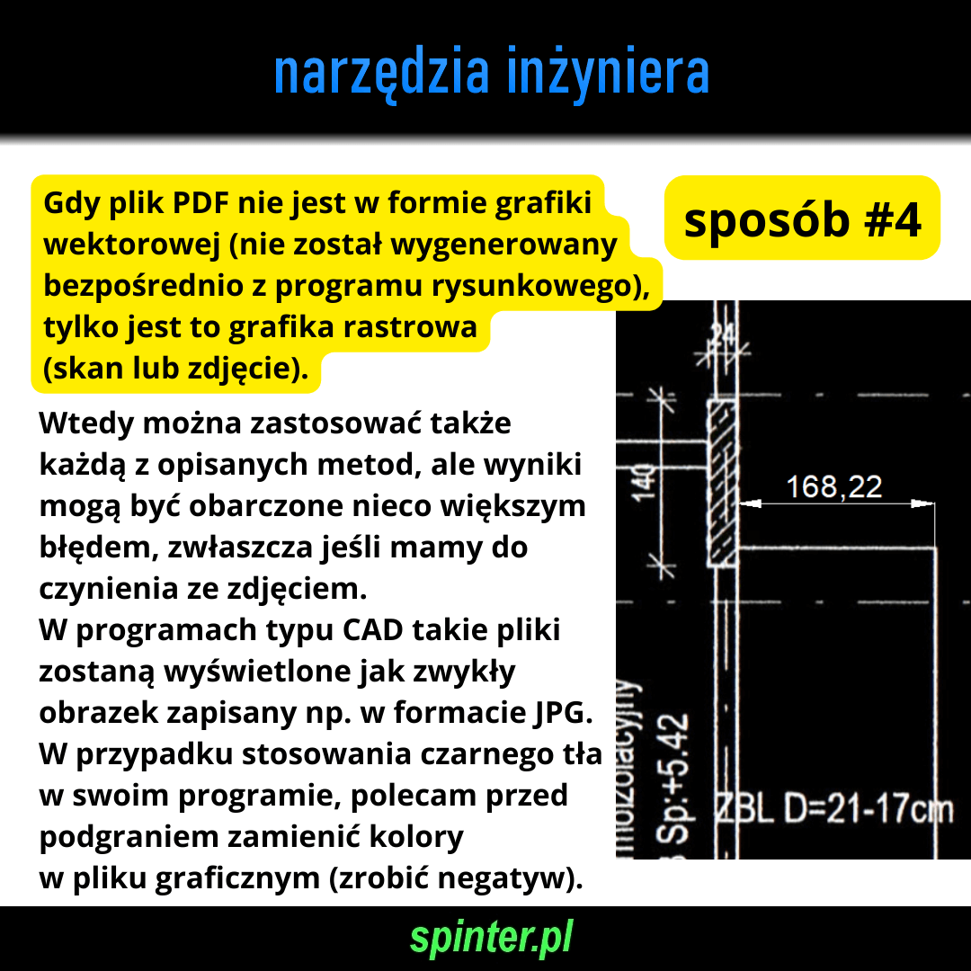 Sposób #4 Gdy plik PDF nie jest w formie grafiki wektorowej (nie został wygenerowany bezpośrednio z programu rysunkowego), tylko jest to grafika rastrowa (skan lub zdjęcie). Wtedy można zastosować także każdą z opisanych metod, ale wyniki mogą być obarczone nieco większym błędem, zwłaszcza jeśli mamy do czynienia ze zdjęciem. W programach typu CAD takie pliki zostaną wyświetlone jak zwykły obrazek zapisany np. w formacie JPG. W przypadku stosowania czarnego tła w CAD’zie, polecam przed podgraniem zamienić kolory w pliku graficznym (zrobić negatyw).