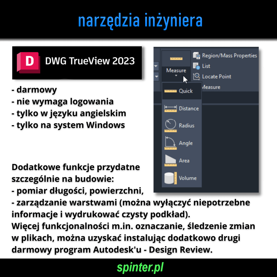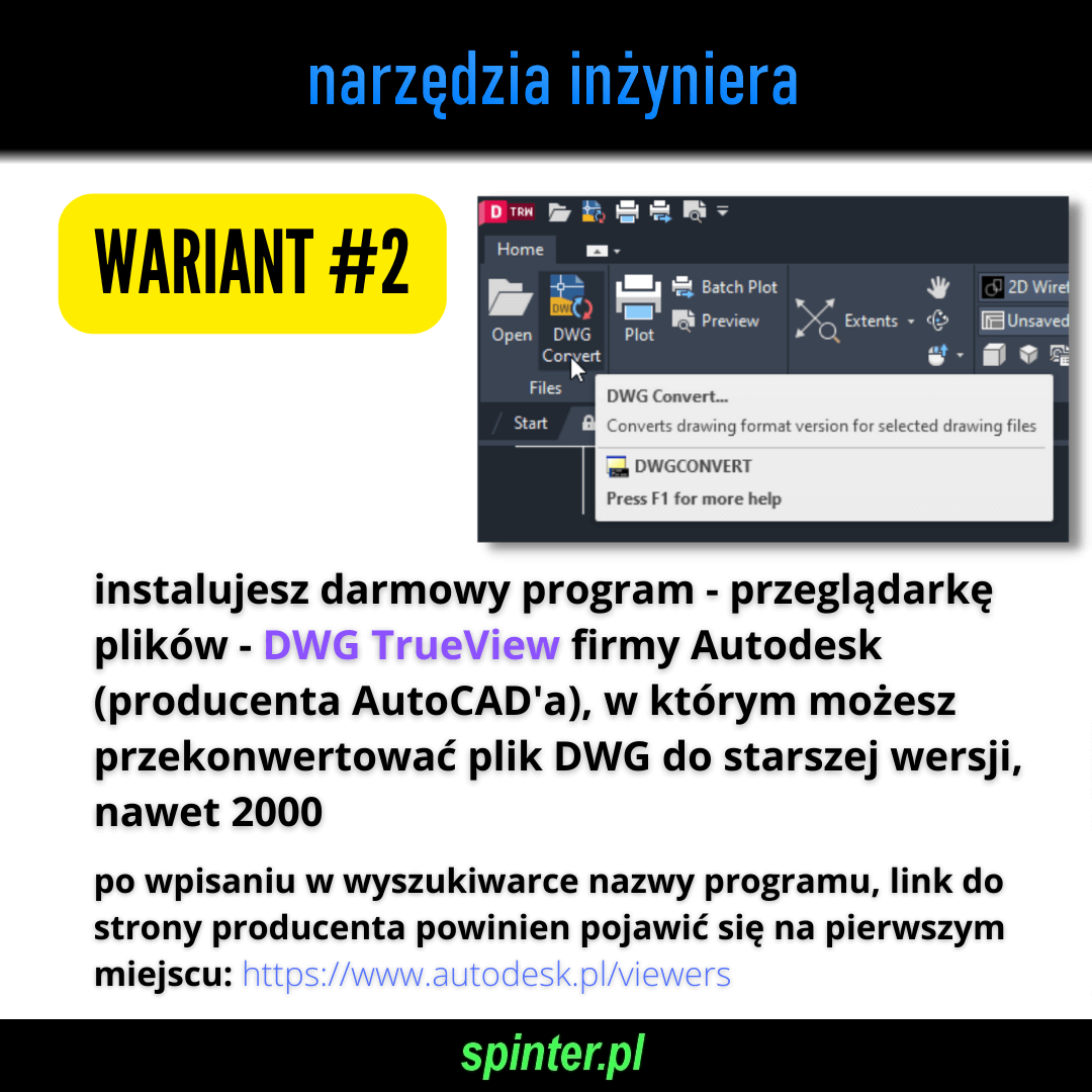 Z pomocą przychodzi firma Autodesk, producent AutoCAD’a. Na swojej stronie udostępnia wiele darmowych narzędzi m.in. program DWG TrueView, w którym można dokonać konwersji plików do starszych wersji czy wykonać niezbędne pomiary na rysunkach.