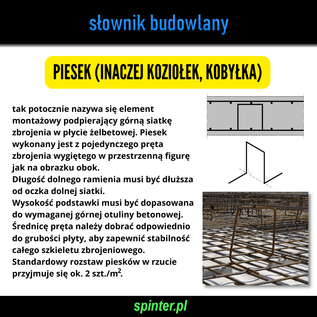 Piesek (inaczej koziołek, kobyłka). Tak potocznie nazywa się element montażowy podpierający górną siatkę zbrojenia w płycie żelbetowej. Piesek wykonany jest z pojedynczego pręta zbrojenia wygiętego w przestrzenną figurę. Długość dolnego ramienia musi być dłuższa od oczka dolnej siatki. Wysokość podstawki musi być dopasowana do wymaganej górnej otuliny betonowej. Średnicę pręta należy dobrać odpowiednio do grubości płyty, aby zapewnić stabilność całego szkieletu zbrojeniowego. Standardowy rozstaw piesków w rzucie przyjmuje się ok. 2 szt./m2.