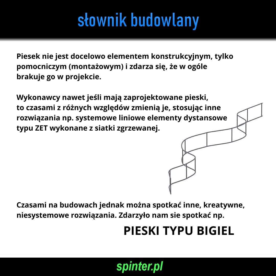 Piesek nie jest docelowo elementem konstrukcyjnym, tylko pomocniczym (montażowym) i zdarza się, że w ogóle brakuje go w projekcie. Wykonawcy nawet jeśli mają zaprojektowane pieski, to czasem z różnych względów zmieniają je, stosując inne rozwiązania np. systemowe liniowe elementy dystansowe typu ZET wykonane z siatki zgrzewanej.