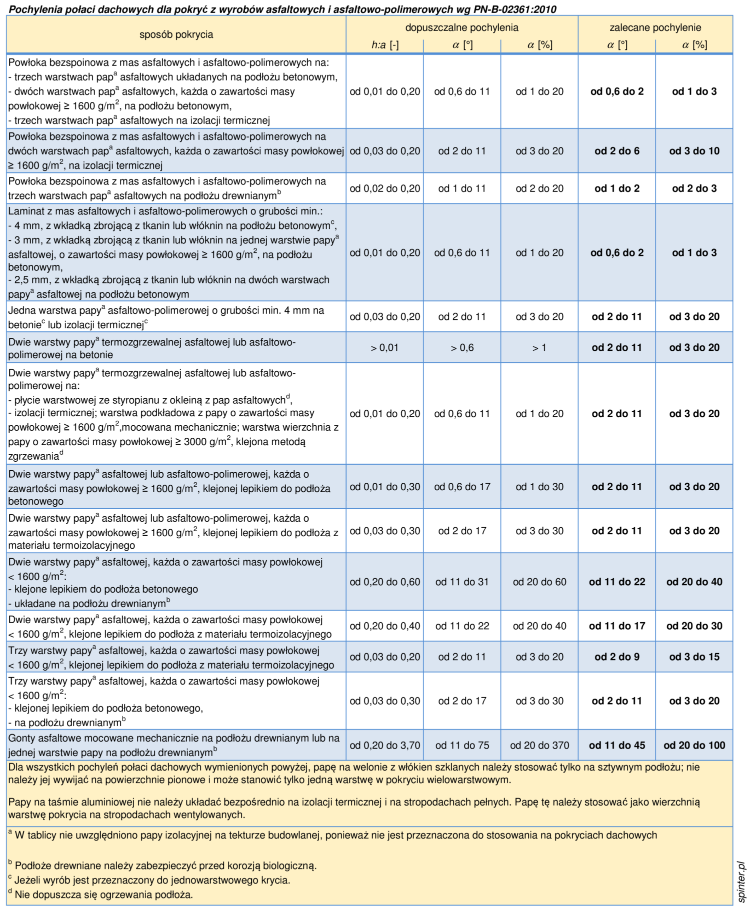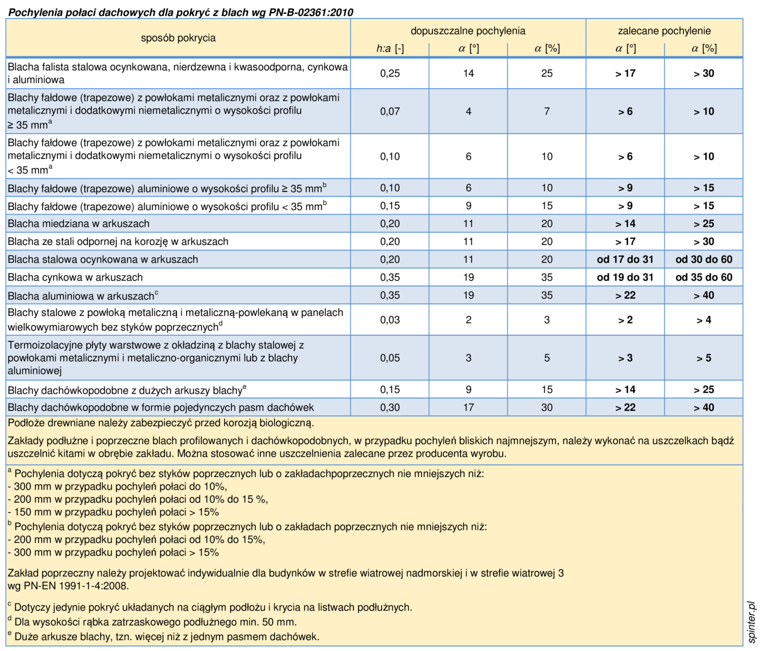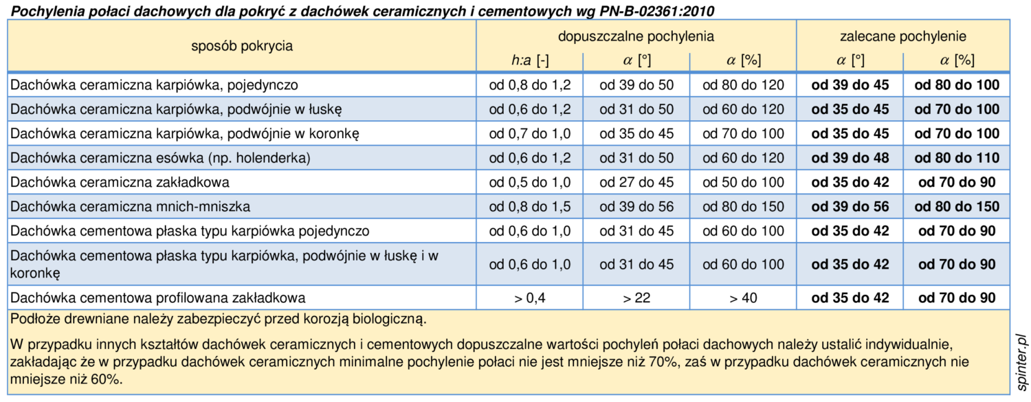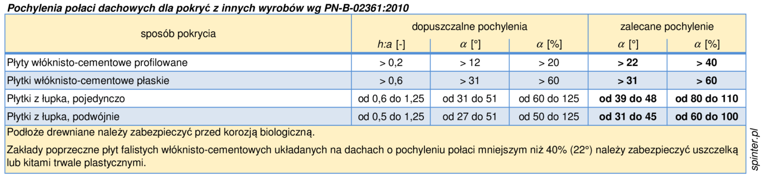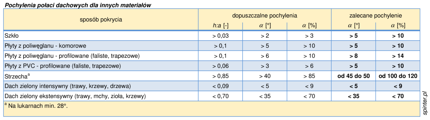 Pochylenie połaci dachowej Dachówki Blachy Papy i masy asfaltowe Tworzywa sztuczne Łupek, płyty włóknisto-cementowe Szkło, poliwęglan, strzecha, dach zielony Zobacz również:miejsca postojowe dla samochodów osobowych ■ klasa odporności pożarowej i ogniowej ■ ustawy dotyczące procesu budowlanego