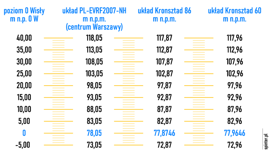 Poziom 0 Wisły odpowiada rzędnej 77,8746 m n.p.m. wg układu Kronsztad 86 (oznaczenia: Kr-86, PL-KRON86-NH).