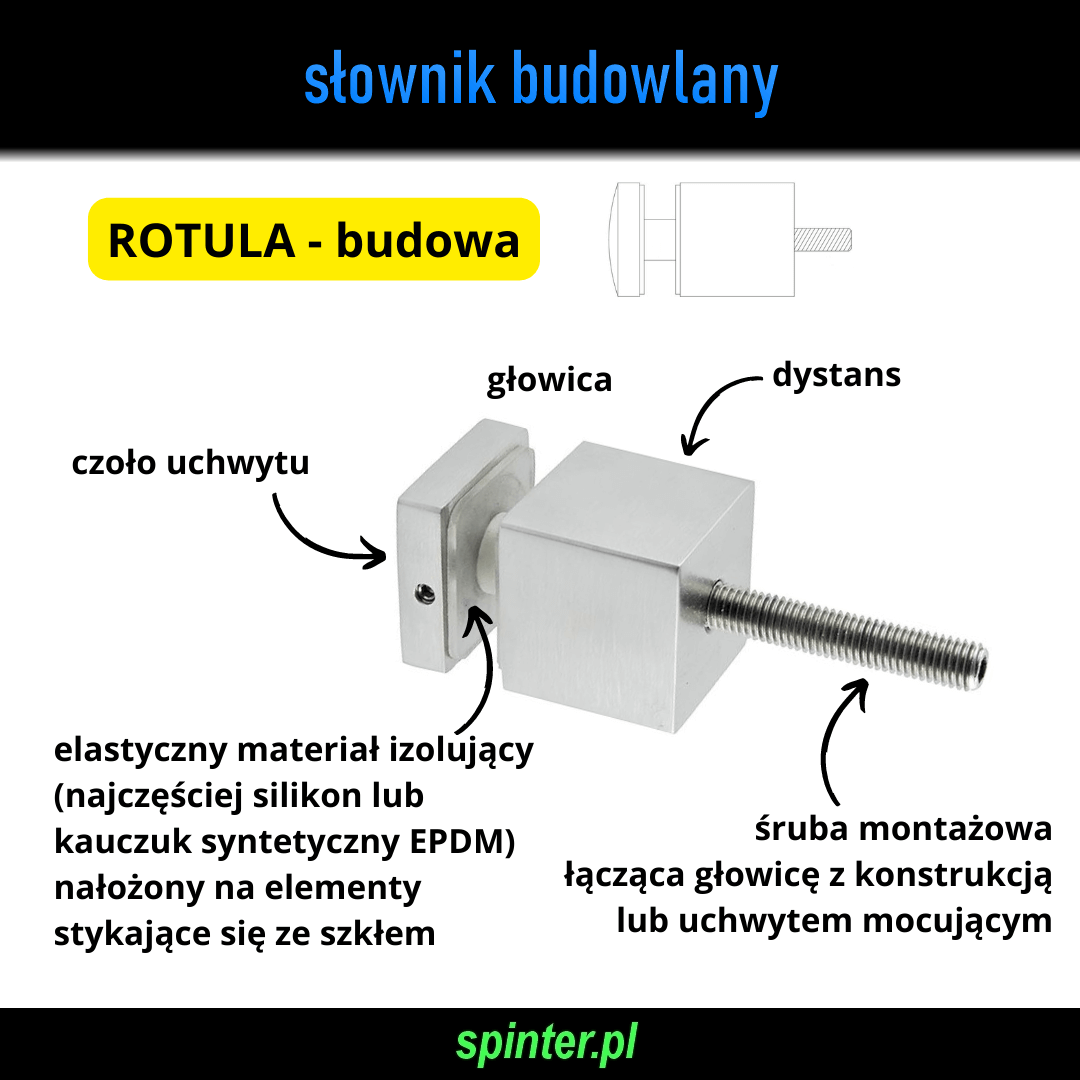 ROTULA – budowa: – głowica (czoło uchwytu z nałożonym od strony styku ze szkłem elastycznym materiałem izolującym, najczęściej z silikonu lub kauczuku syntetycznego EPDM), – dystans, – śruba montażowa łącząca głowicę z konstrukcją lub uchwytem mocującym.