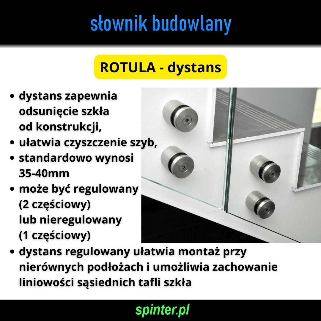 ROTULA – dystans: – dystans zapewnia odsunięcie szkła od konstrukcji, – ułatwia czyszczenie szyb, – standardowo wynosi 35-40 mm, – może być regulowany (2 częściowy) lub nieregulowany (1 częściowy), – dystans regulowany ułatwia montaż przy nierównych podłożach i umożliwia zachowanie liniowości sąsiednich tafli szkła.