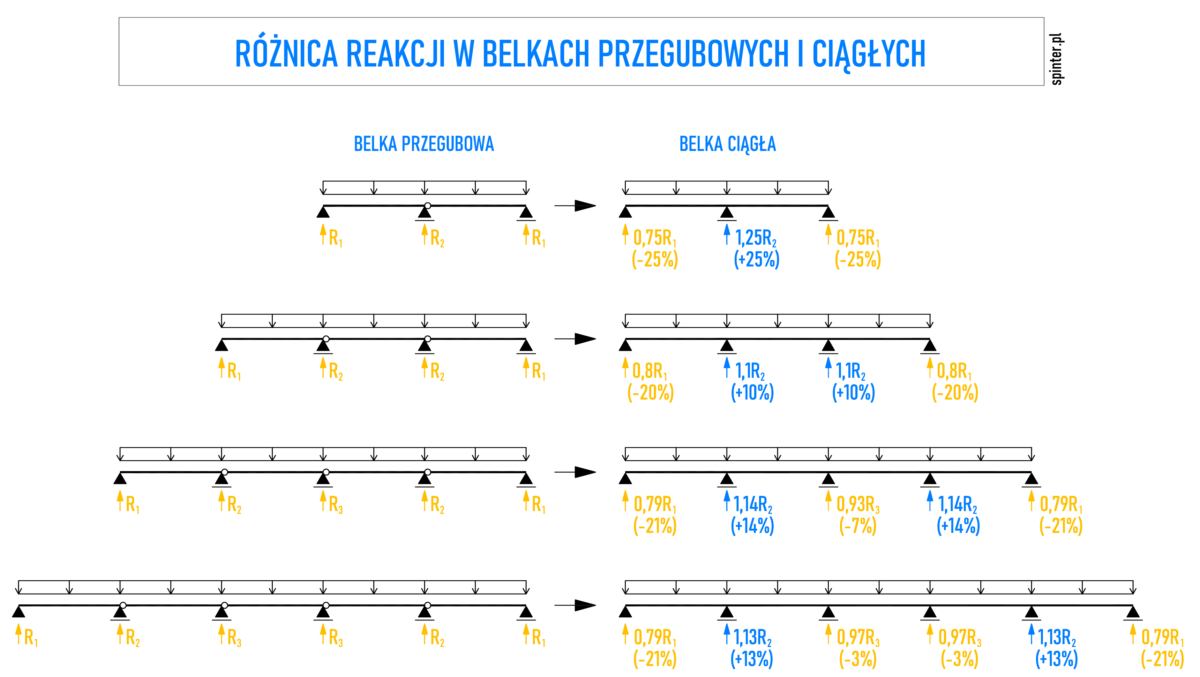 REAKCJE BELEK CIĄGŁYCH Poniższe schematy określają zmianę reakcji na podporach belek ciągłych w stosunku do układów przegubowych. Zobacz również:kalkulator – parcie spoczynkowe ■ rozszerzalność termiczna ■ podatność podpór