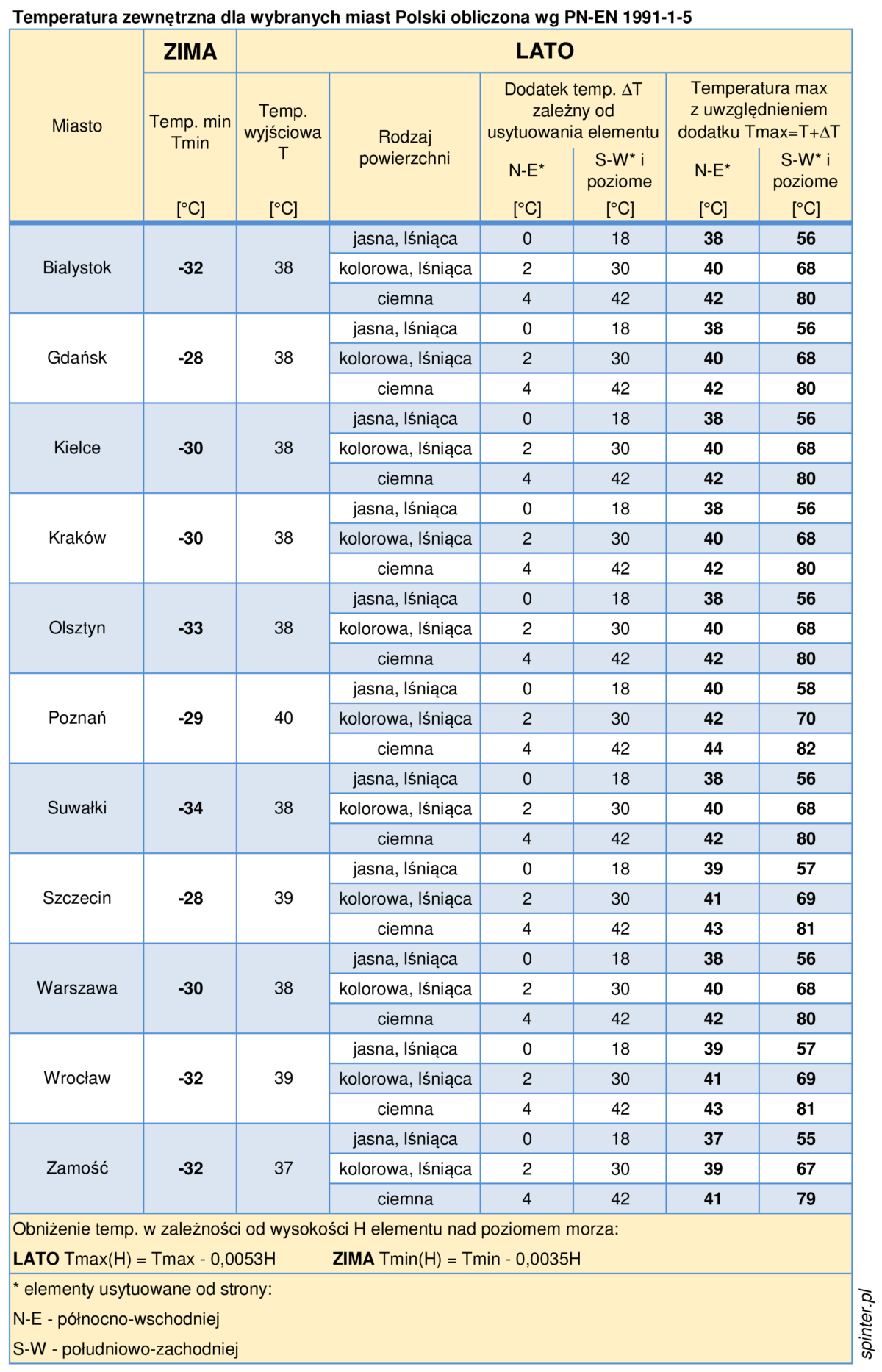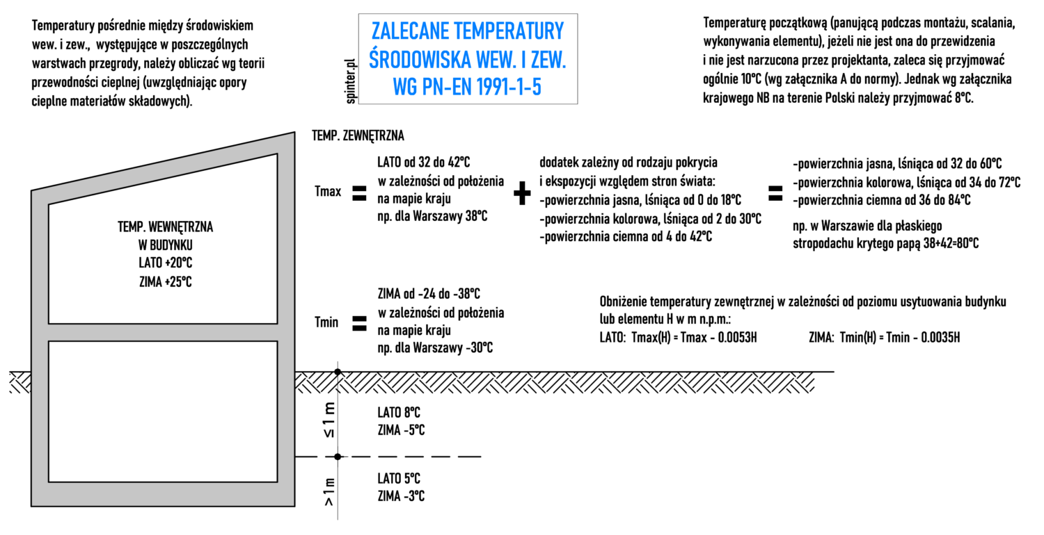 W przypadku, gdy po obu stronach elementu występują różne temperatury, to temperaturę końcową określamy jako wartość średnią w osi elementu, np. nieocieplony stropodach żelbetowy od spodu, od strony pomieszczenia osiąga temp. 20°C, a od wierzchu 70°C, to średnia temperatura w połowie grubości płyty wyniesie t1 = 20+(70-20)/2 = 45°C.