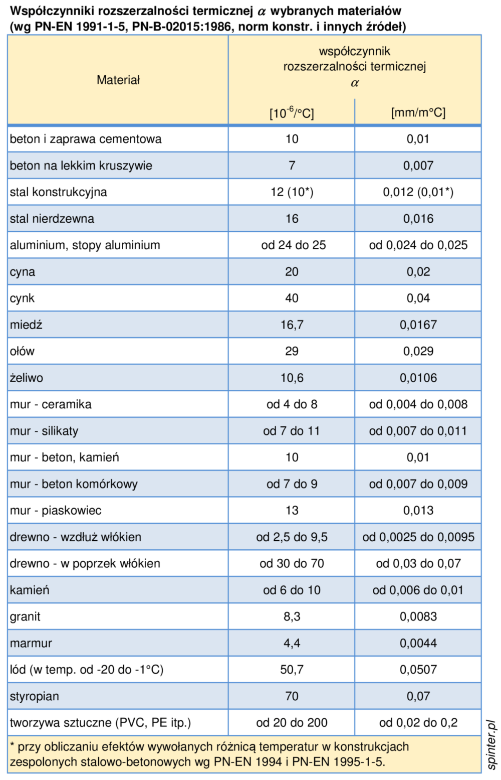 α – współczynnik rozszerzalności termicznej zależny od materiału, z którego wykonany jest element [1/°C lub mm/m°C]
