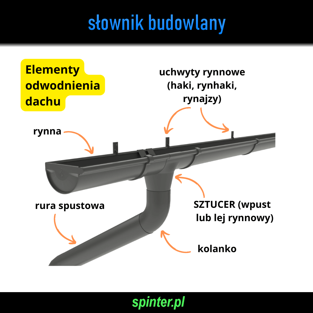 Do elementów odwodnienia dachu należą: – rynna mocowana za pomocą uchwytów do dachu (haki, rynhaki, rynajzy), – sztucer (wpust lub lej rynnowy), – rura spustowa i kolanka łączące.