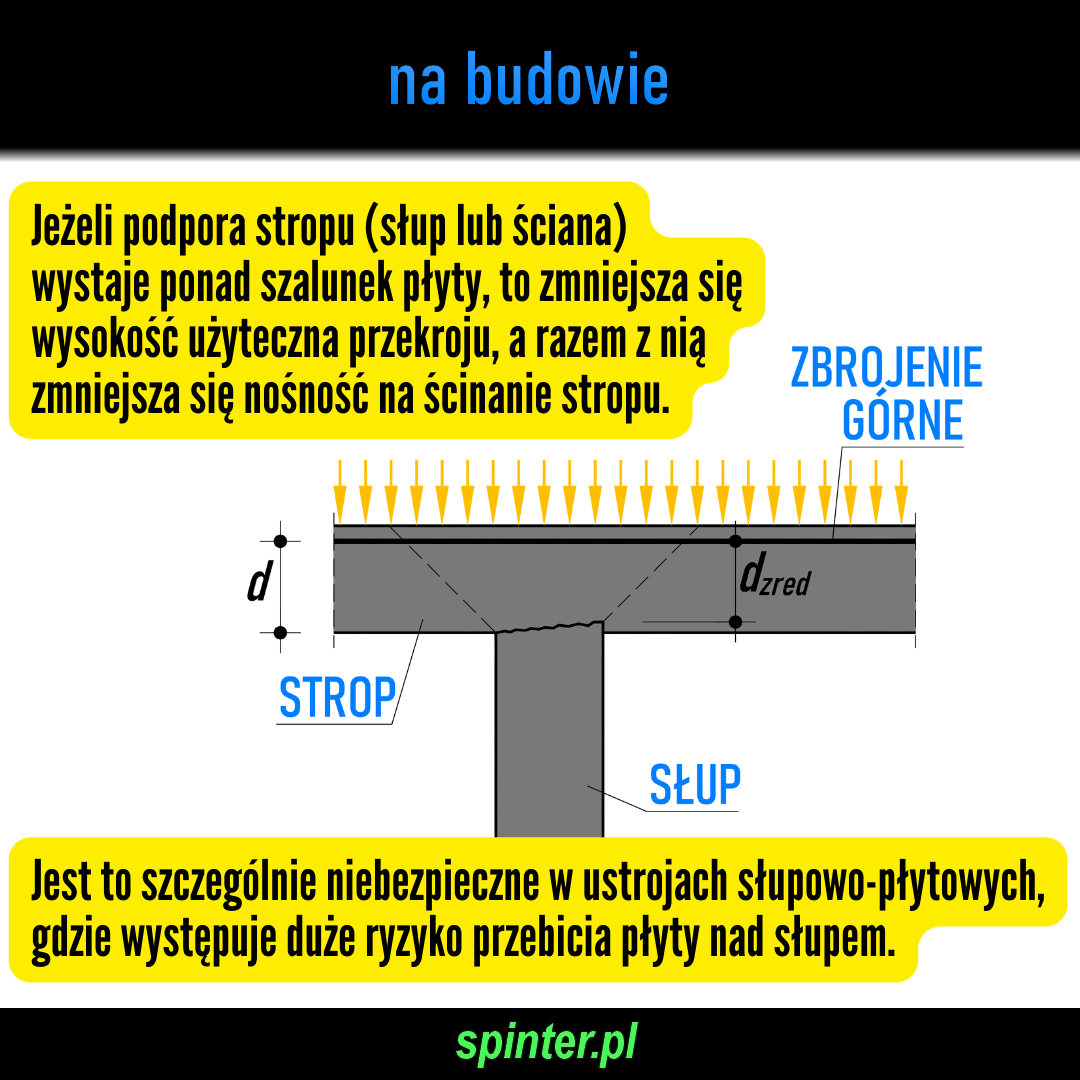 Jeżeli podpora stropu (słup lub ściana) wystaje ponad szalunek płyty, to zmniejsza się wysokość użyteczna przekroju, a razem z nią zmniejsza się nośność na ścinanie stropu.
