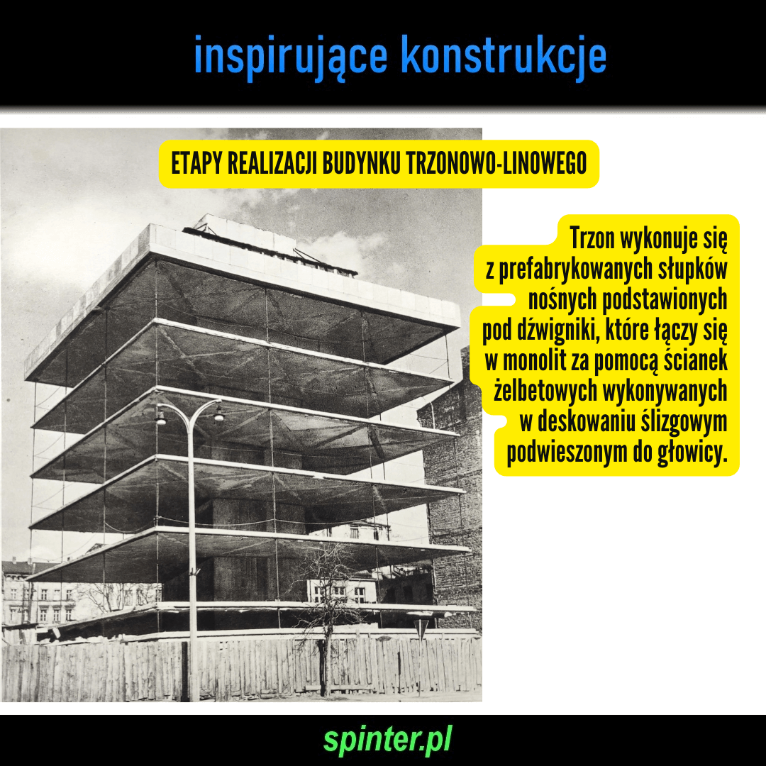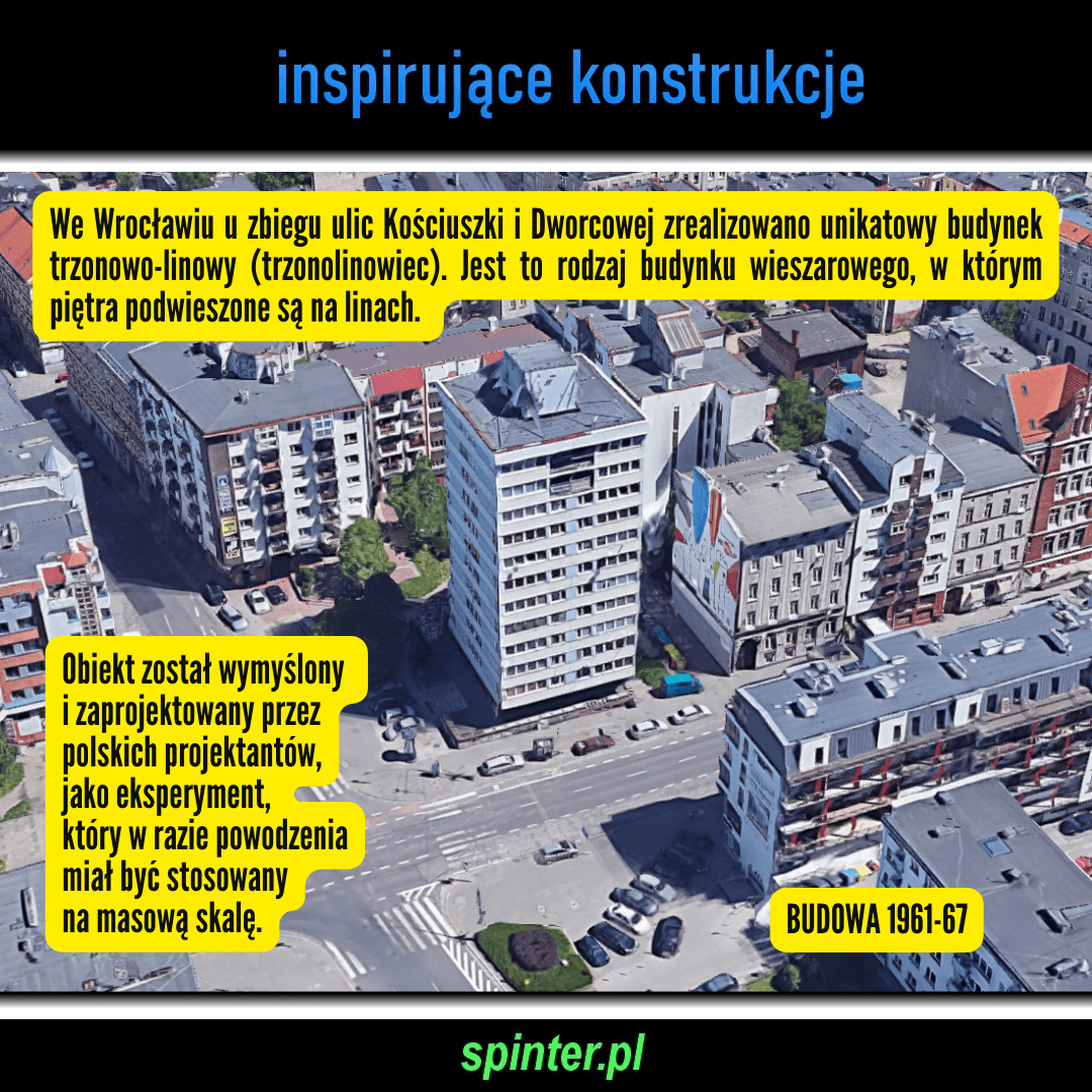 We Wrocławiu u zbiegu ulic Kościuszki i Dworcowej zrealizowano unikatowy budynek trzonowo-linowy (trzonolinowiec). Jest to rodzaj budynku wieszarowego, w którym piętra podwieszone są na linach. Obiekt został wymyślony i zaprojektowany przez polskich projektantów A. Skorupę i J. Burzyńskiego jako eksperyment, który w razie powodzenia miał być stosowany na masową skalę.