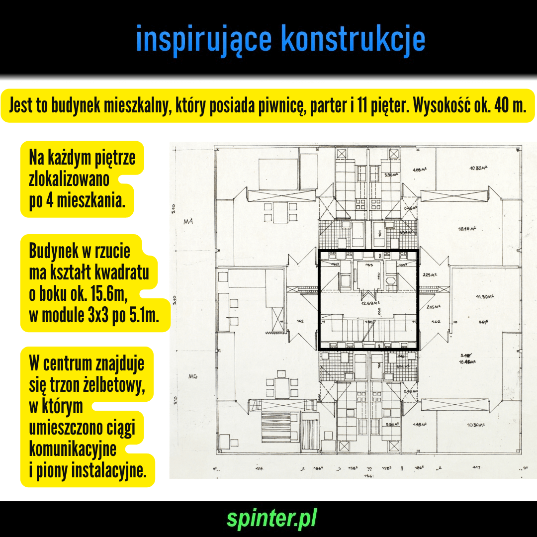 Jest to budynek mieszkalny, który posiada piwnicę, parter i 11 pięter. Wysokość obiektu ok. 40 m. Na każdym piętrze zlokalizowano po 4 mieszkania. Budynek w rzucie ma kształt kwadratu o boku ok. 15.6 m, w module 3×3 po 5.1 m. W centrum znajduje się trzon żelbetowy, w którym umieszczono ciągi komunikacyjne i piony instalacyjne.