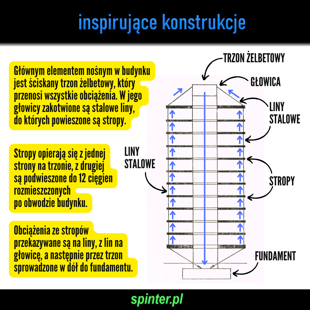 Głównym elementem nośnym w budynku jest ściskany trzon żelbetowy, który przenosi wszystkie obciążenia. W jego głowicy zakotwione są stalowe liny, do których podwieszone są stropy. Stropy opierają się z jednej strony na trzonie, z drugiej są podwieszone do 12 cięgien rozmieszczonych po obwodzie budynku. Obciążenia ze stropów przekazywane są na liny, z lin na głowicę, a następnie przez trzon sprowadzone w dół do fundamentu.