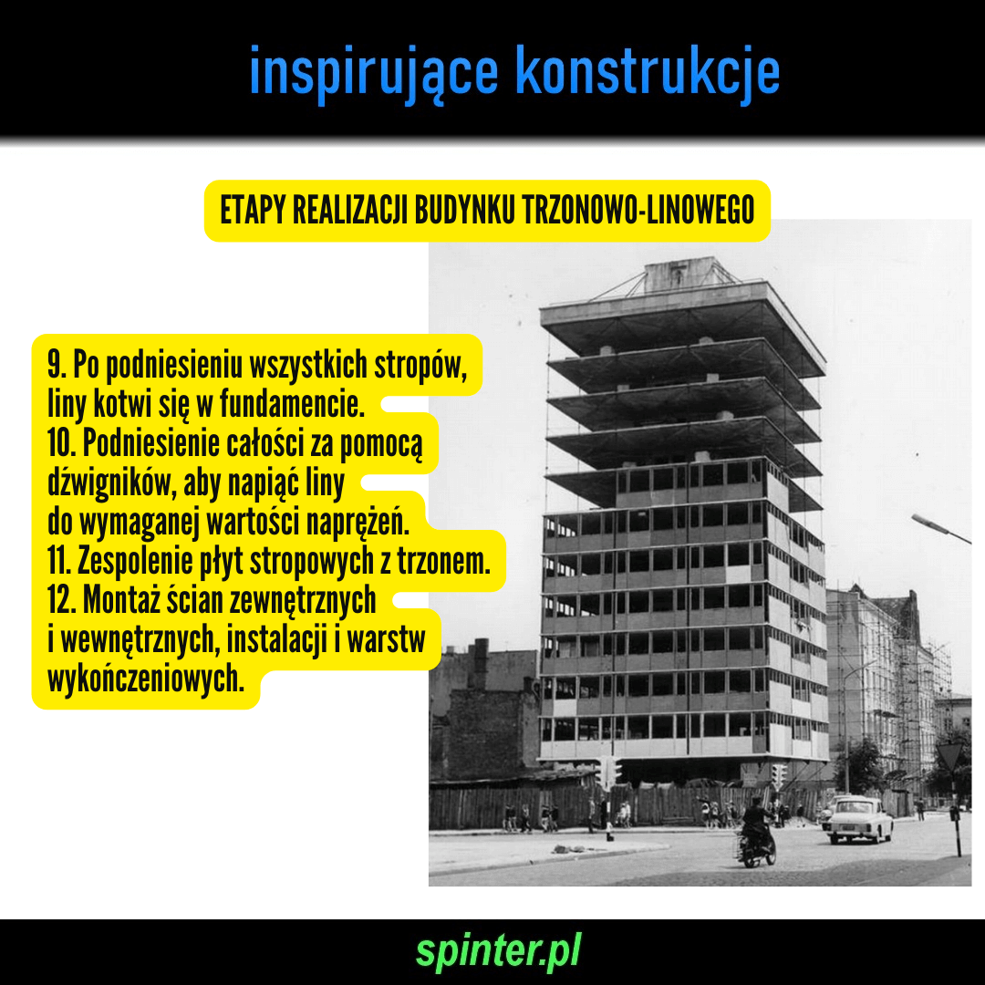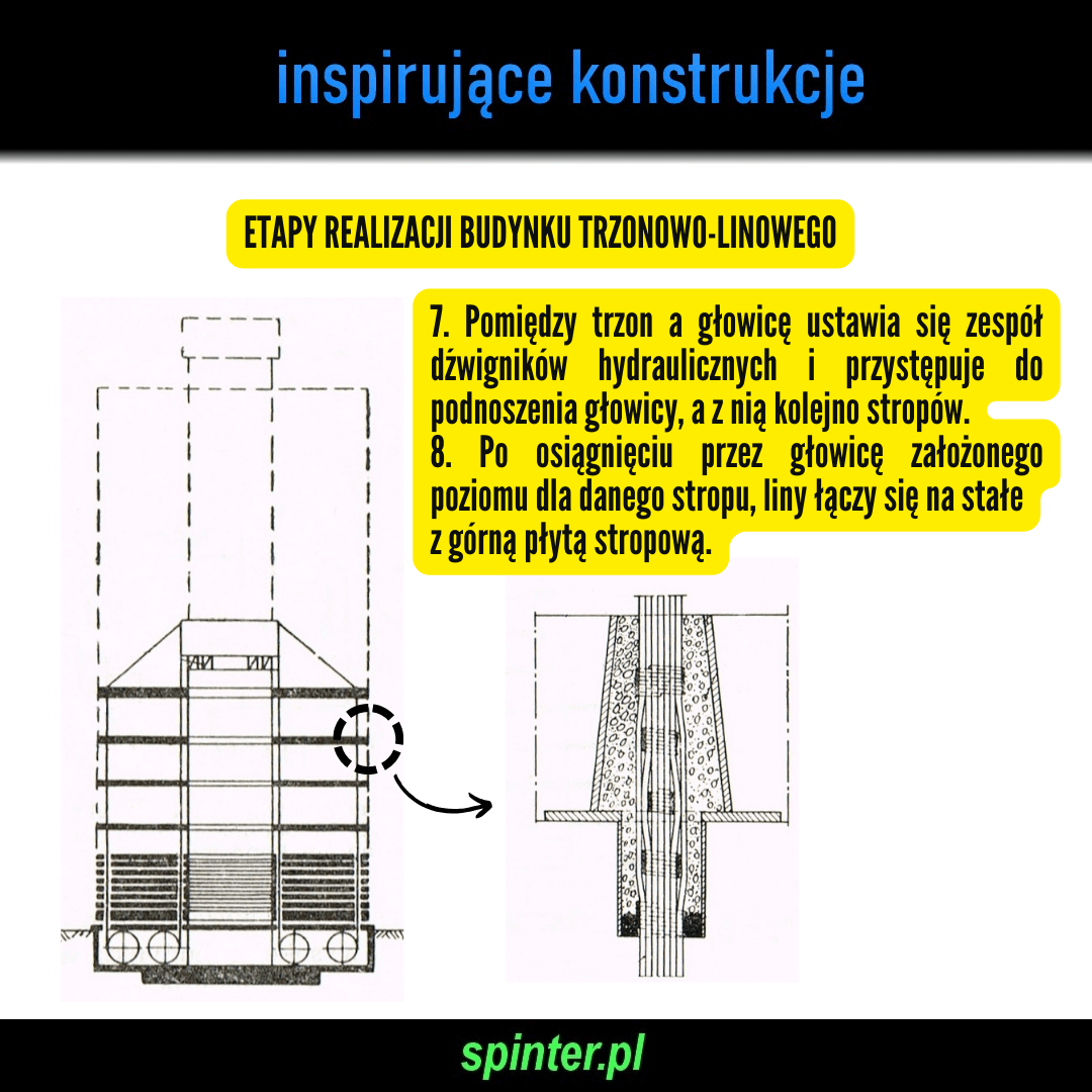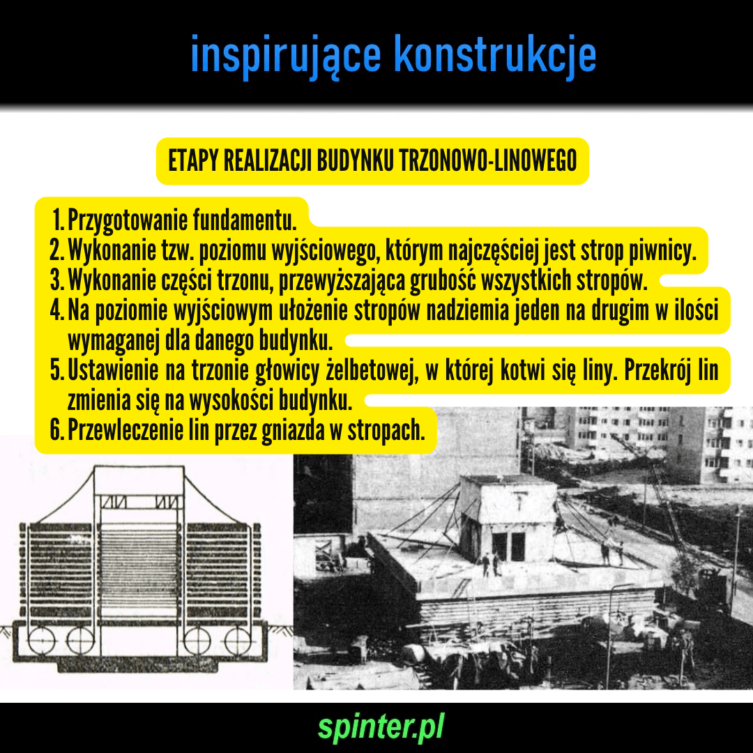 Etapy realizacji budynku trzonowo-linowego: 1. Przygotowanie fundamentu. 2. Wykonanie tzw. poziomu wyjściowego, którym najczęściej jest strop piwnicy. 3. Wykonanie części trzonu, przewyższająca grubość wszystkich stropów. 4. Na poziomie wyjściowym ułożenie stropów nadziemia jeden na drugim w ilości wymaganej dla danego budynku. 5. Ustawienie na trzonie głowicy żelbetowej, w której kotwi się liny. Przekrój lin zmienia się na wysokości budynku. 6. Przewleczenie lin przez gniazda w stropach. 7. Pomiędzy trzon a głowicę ustawia się zespół dźwigników hydraulicznych i przystępuje do podnoszenia głowicy, a z nią kolejno stropów. 8. Po osiągnięciu przez głowicę założonego poziomu dla danego stropu, liny łączy się na stałe z górną płytą stropową. Trzon wykonuje się z prefabrykowanych słupków nośnych podstawionych pod dźwigniki, które łączy się w monolit za pomocą ścianek żelbetowych wykonywanych w deskowaniu ślizgowym podwieszonym do głowicy. 9. Po podniesieniu wszystkich stropów, liny kotwi się w fundamencie. 10. Podniesienie całości za pomocą dźwigników, aby napiąć liny do wymaganej wartości naprężeń. 11. Zespolenie płyt stropowych z trzonem. 12. Montaż ścian zewnętrznych i wewnętrznych, instalacji i warstw wykończeniowych.