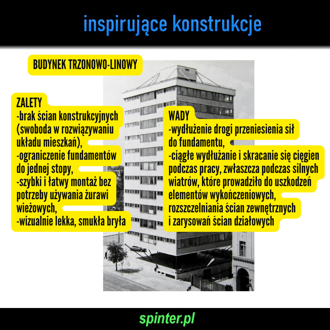 WADY: -wydłużenie drogi przeniesienia sił do fundamentu, -ciągłe wydłużanie i skracanie się cięgien podczas pracy, zwłaszcza podczas silnych wiatrów, które prowadziło do uszkodzeń elementów wykończeniowych, rozszczelniania ścian zewnętrznych i zarysowań ścian działowych.