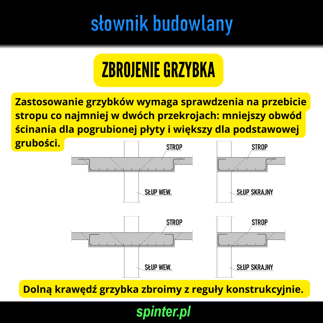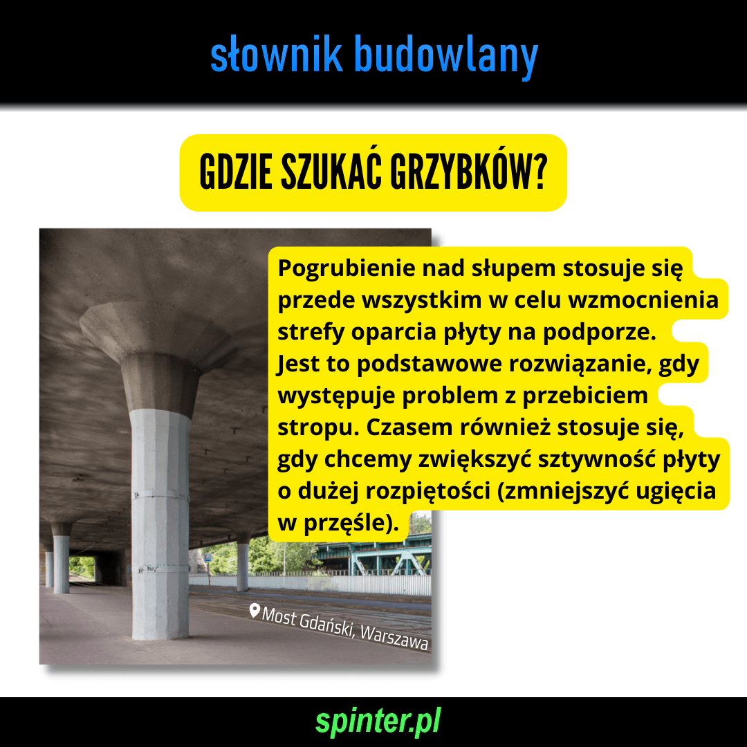 Gdzie szukać grzybków? Pogrubienie nad słupem stosuje się przede wszystkim w celu wzmocnienia strefy oparcia płyty na podporze. Jest to podstawowe rozwiązanie, gdy występuje problem z przebiciem stropu. Czasami również stosuje się, gdy chcemy zwiększyć sztywność płyty o dużej rozpiętości (zmniejszyć ugięcia w przęśle).