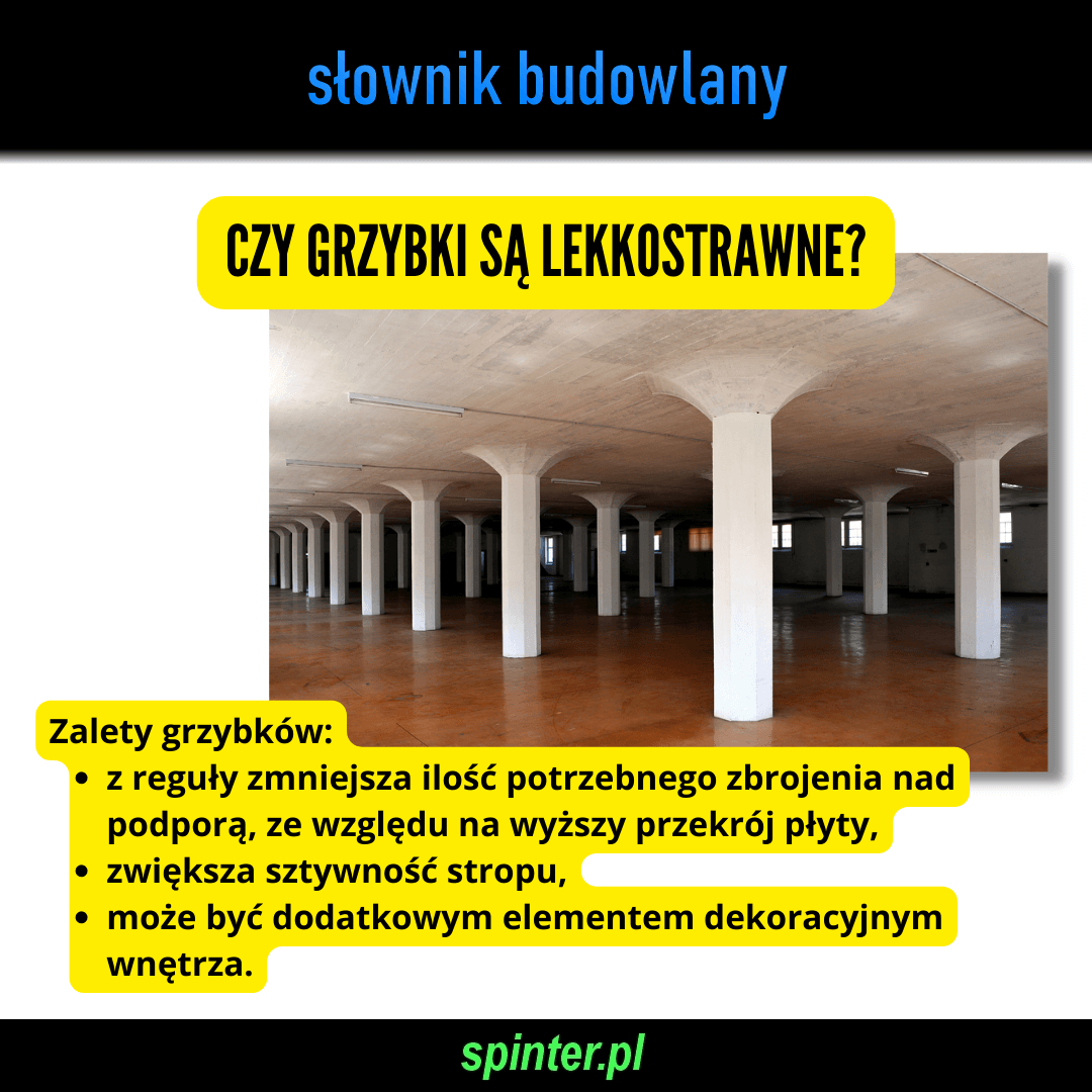 Zalety grzybków: – z reguły zmniejszają ilość potrzebnego zbrojenia nad podporą, ze względu na wyższy przekrój płyty, – zwiększają sztywność stropu, – mogą być dodatkowym elementem dekoracyjnym wnętrza.
